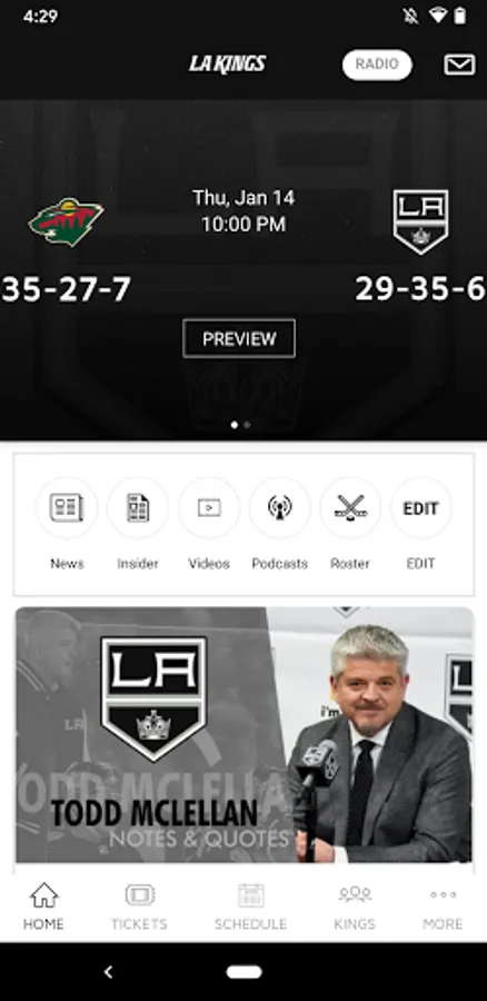 Download the new LA Kings App for the 2021 NHL Season! The central place for all your news, podcasts, scores, stats, exclusive content and videos, ticketing and access to game night Kings Care Foundation auctions. Plus, free to play games, and listen to every game live!