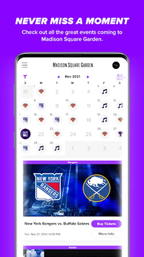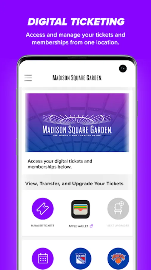 The MSG App is the official app for your visit to the World’s Most Famous Arena! Entering MSG is now fully digital – the MSG App allows you to access and manage your tickets and memberships from one location. You can also discover venue features, plan your visit, view upcoming events through our intuitive calendar, and even book a luxury suite for select events.