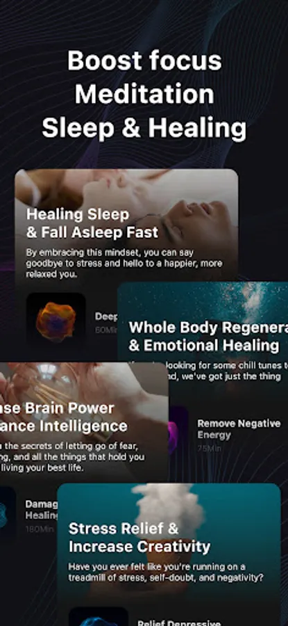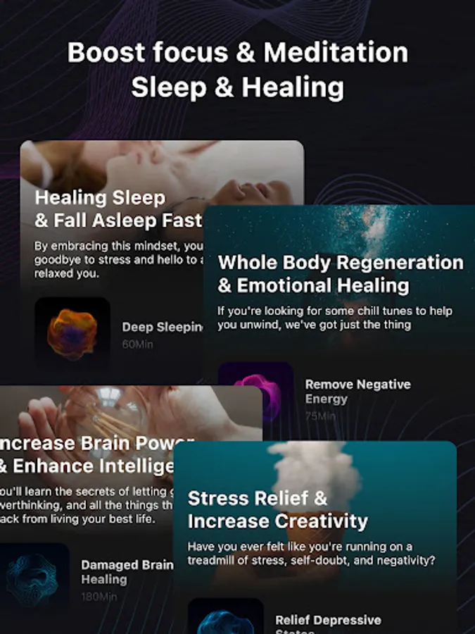 Our binaural beats are designed to stimulate your brain's natural frequency and promote positive changes in your mood, energy levels, and cognitive function. Our tracks range from Relaxation, Concentration, to Sleep, each with carefully selected frequencies that cater to your specific needs. We also offer a range of ambient music that includes Nature, piano and other soothing sounds, to further enhance your relaxation and sleep experience. Selected programs for Focus,Relaxation, Sleep, Meditation, Anxiety, Depression, Stress Relief, Positive Mind, Confidence, Memory, Healing, Brain Function, and much more!