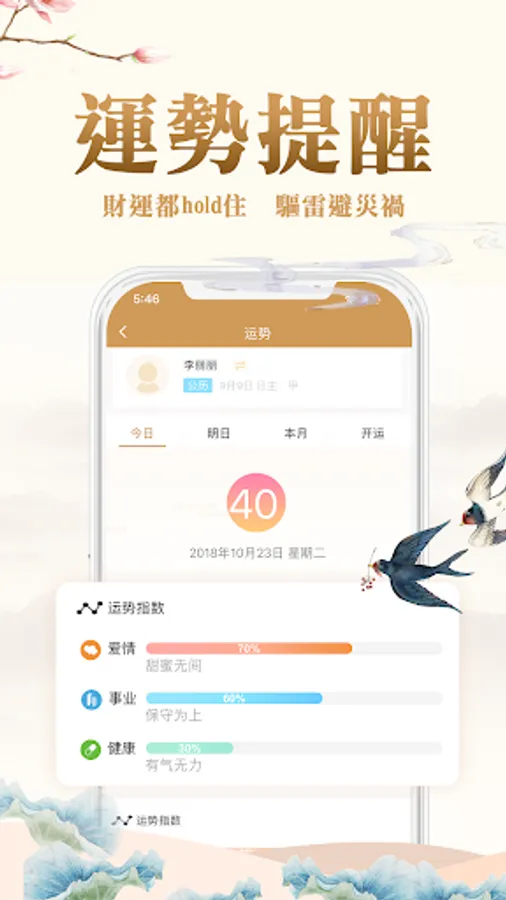 【每日运势】专属定制属于你八字的开运日历,便捷查看每天运势、每个时辰的行事宜忌、穿衣饮食等开运指南。