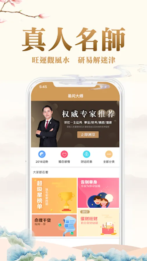 专业周易算命大师专家团,在线为你解疑释惑,助你预测命运,掌握未来运势!通过八字算命、紫微斗数、奇门占测、测名起名改名、老黄历择吉、周公解梦、星座塔罗占卜、六爻卜卦问事、手面相解读、风水调整等各种专业中华传统的手法,助你掌控命运规律和开运秘法,解决所有运势难题,让你事业求财前程无忧,恋爱婚姻称心如意,成就幸福人生!