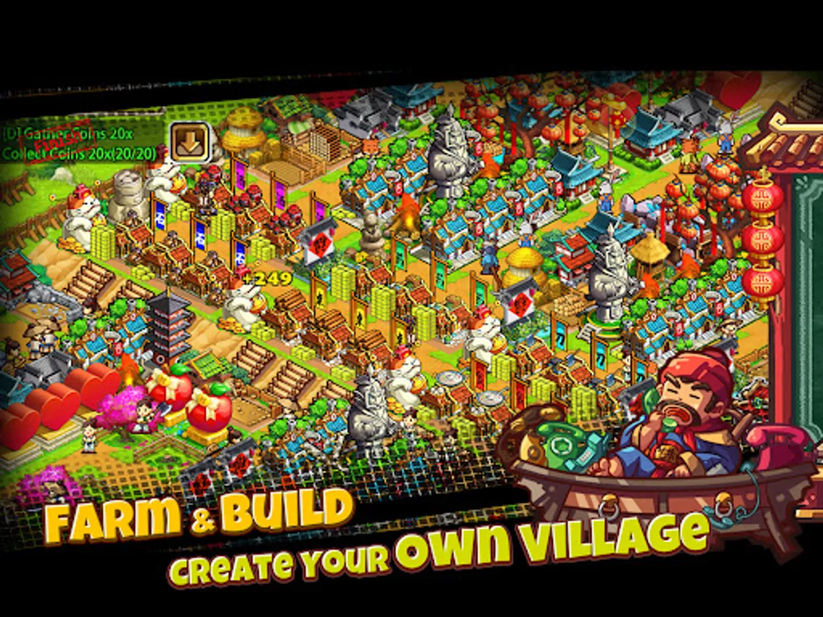 Village Simulation: As the head of your village, you can recruit farmers to farm land, build houses, plant trees, log trees, mine gold and produce goods, to earn coins in various ways! In addition, you can design your village by arranging buildings and training farmers &merchants to maximize the village profit and prepare enough resources for your conquest of the world.