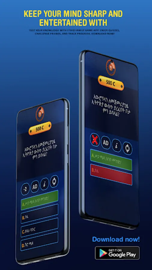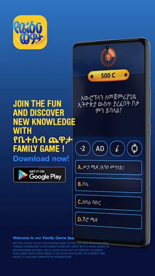 Are you ready to put your knowledge to the test and discover new things? Download Ethio Family Game app now! With a wide range of entertaining quizzes, you'll never run out of content to enjoy. Challenge your loved ones to see who can score the highest and create a fun and competitive atmosphere.