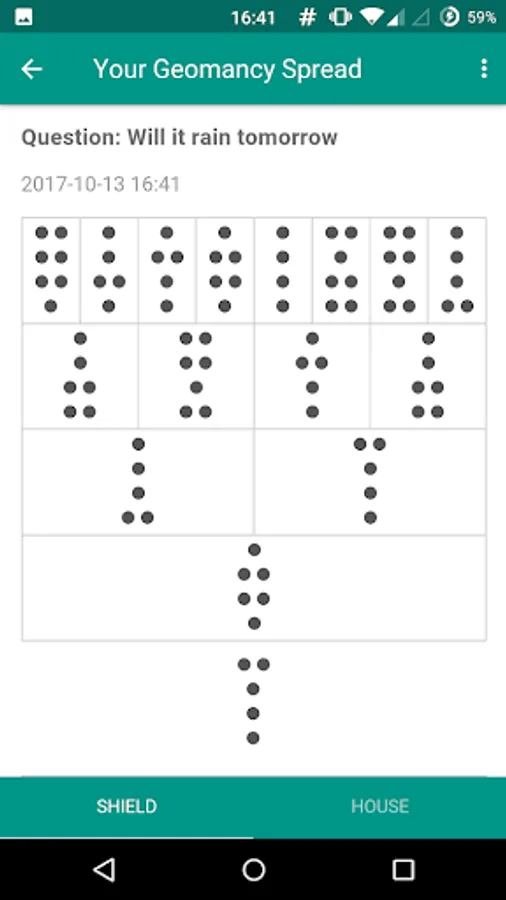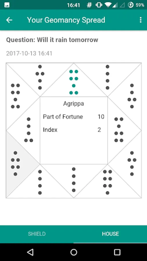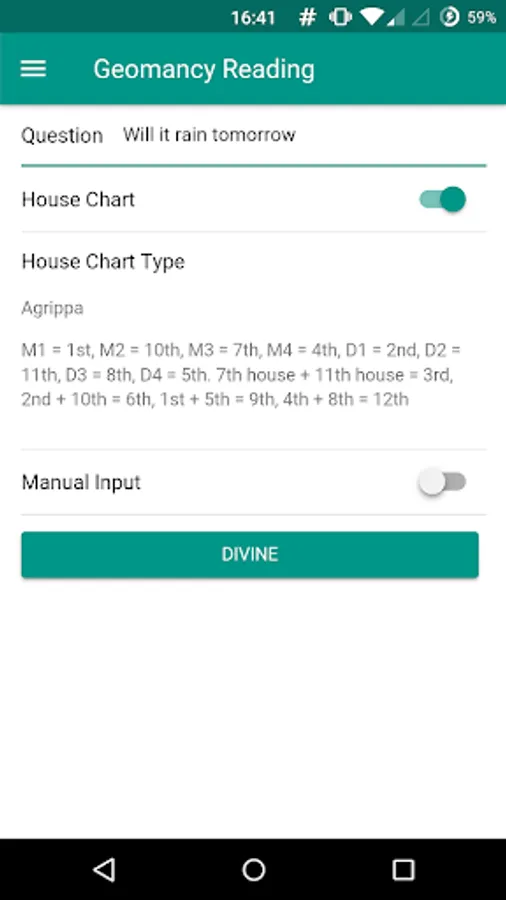 Geomancy Chan is the Geomancy app for Android. (Geomancy is a western medieval divination method. This app is NOT about Chinese Geomancy)