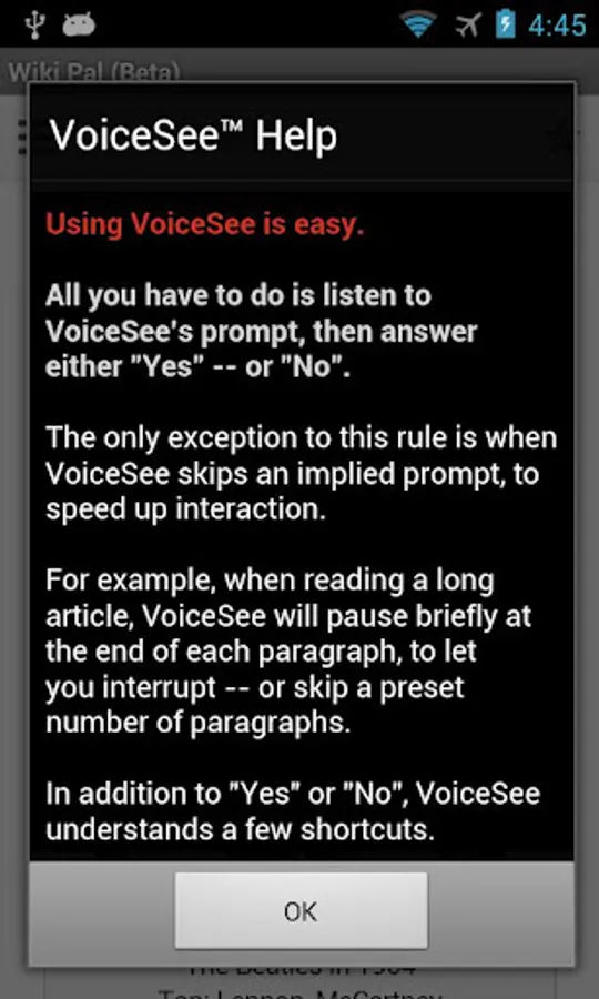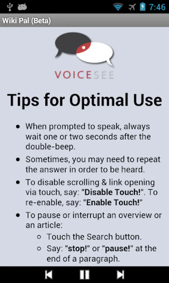 Utilizing the latest state of the art text-to-speech and speech recognition technologies, VoiceSee™ Wiki Pal is the world's first hands-free *and* eyes-free Wikipedia web browser for your Android mobile phone or tablet.