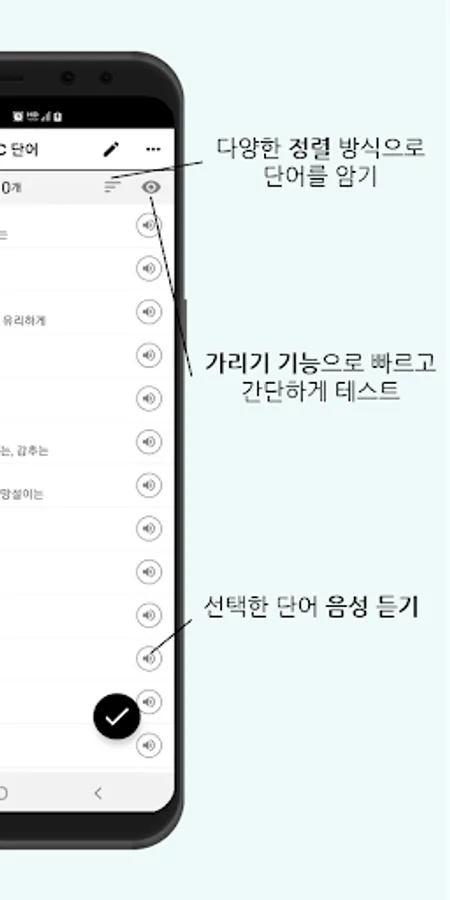 You can easily memorize checks through various sorting methods and hiding words or meanings.