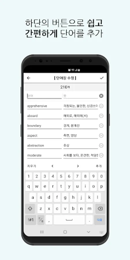[Clear input value], [Move to word/meaning column], and [Add word] buttons are located right above the keyboard, so you can use it easily and conveniently without having to move a lot of hands.