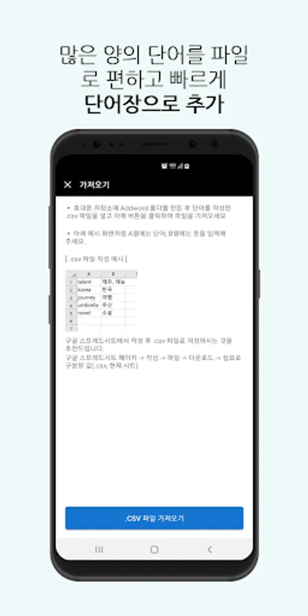 You can import a large amount of words into a .csv file and turn it into a vocabulary book.