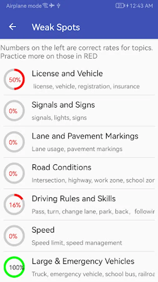 Knowledge questions are assigned to sections and topics based on Driver's Manual. You can choose certain sections or topics to practice.