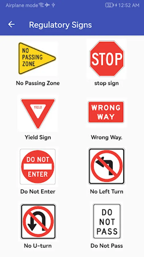 Road signs are assigned into different groups, e.g. warning signs, regulatory signs. And they can be shown in a list or flashcard mode. A straight forward and clear way for you to learn these signs.