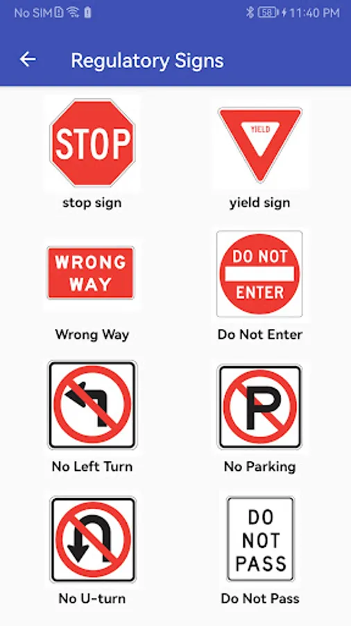 Road signs are assigned into different groups, e.g. warning signs, regulatory signs. And they can be shown in a list or flashcard mode. A straight forward and clear way for you to learn these signs.