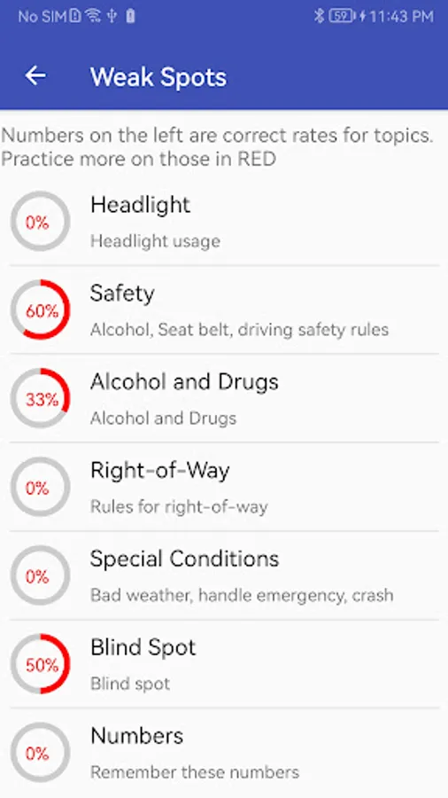 Knowledge questions are assigned to sections and topics based on Driver Manual. You can choose certain sections or topics to practice.