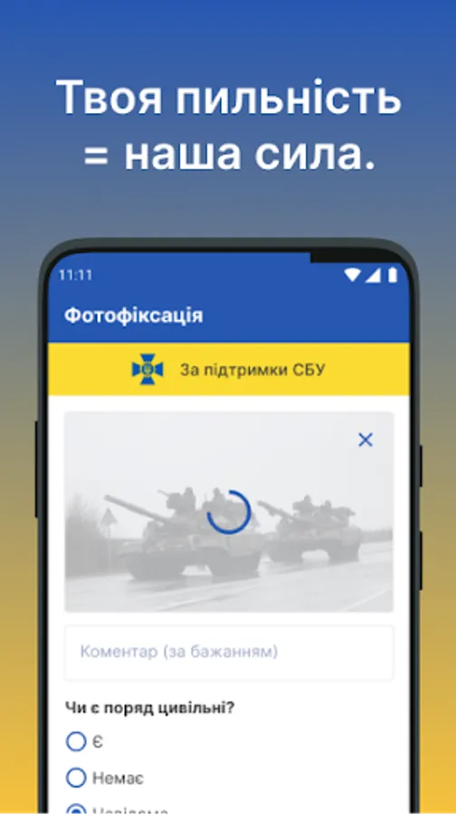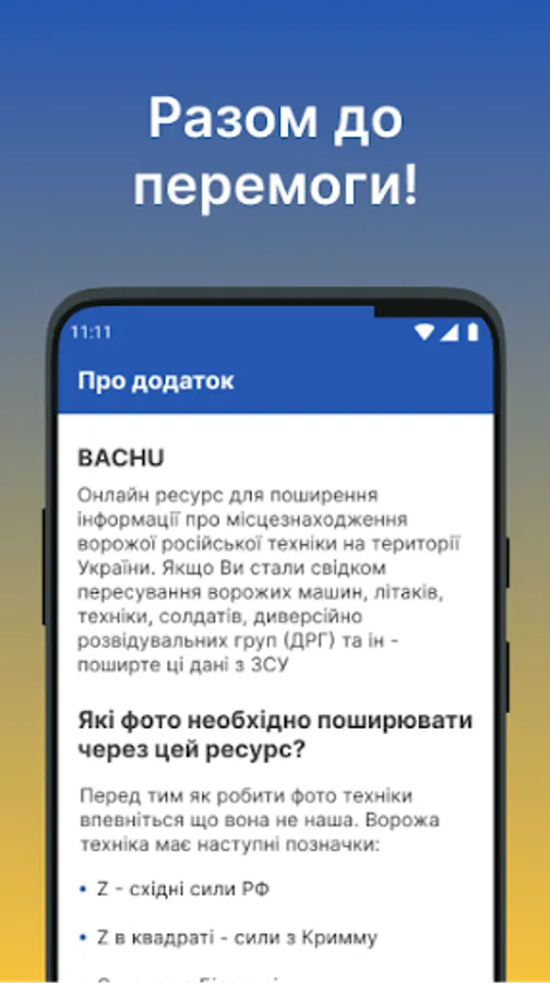 An application for disseminating information about the location of enemy Russian equipment, soldiers and dangerous objects on the territory of Ukraine. If you have witnessed the movement of enemy vehicles, aircraft, equipment, soldiers, sabotage and reconnaissance groups (DRG), etc. - spread this information from the Armed Forces.