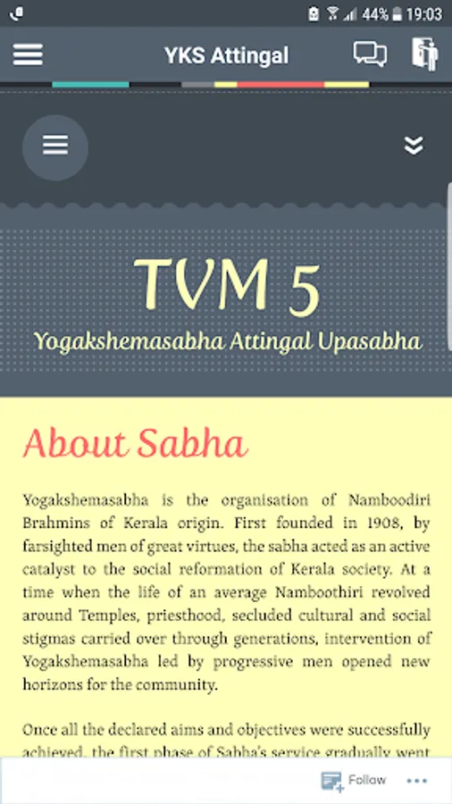About Attingal Upasabha: Yogakshemasabha Attingal Upasabha was established in 2000 with the register number TVM- 5. After few years of activity, upasabha become inactive at the end of 2007. In 2013, Upasabha was reestablished under the leadership of Dr. Madhavan Namboothiri, Subrahmanian Namboothiri and other active members. Yogakshemasabha Attingal Upasabha won Best Upasabha Award by Thiruvananthapuram District Sabha in 2015. Attingal Upasabha has a supportive and active IT Cell, under youth wing. This Android App was powered by Yogakshemasabha Attingal Yuvajanasabha for updating awareness about our activities.