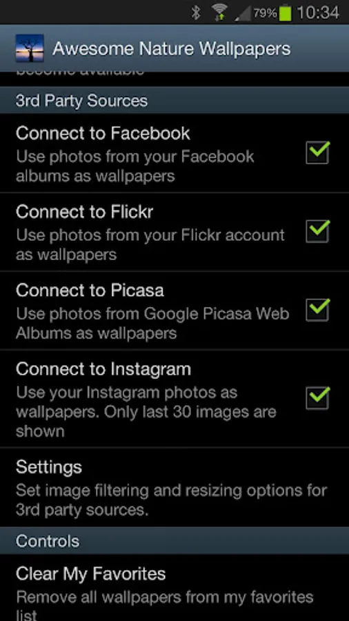 - Use images from your own gallery as wallpapers. Images stored on your device can be added to favourite wallpapers ('Options Menu'->'Add Image' in 'Favourite Wallpapers' screen).