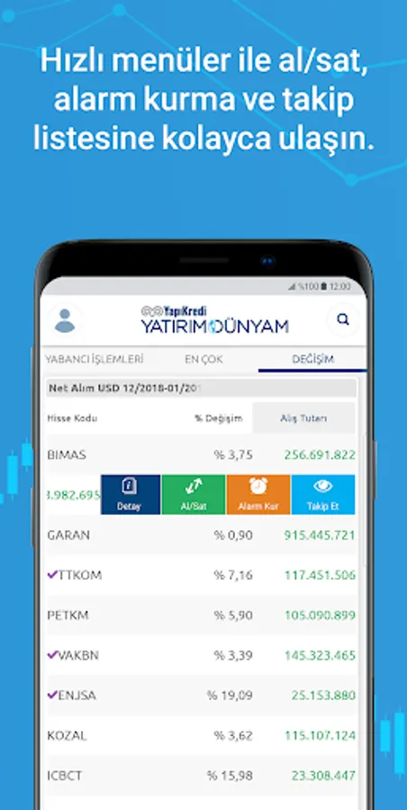 Within the application, you can access the quick menus with the left scrolling motion on the securities codes, so you can buy / sell, set up an alarm, add to the list and get detailed information easily.