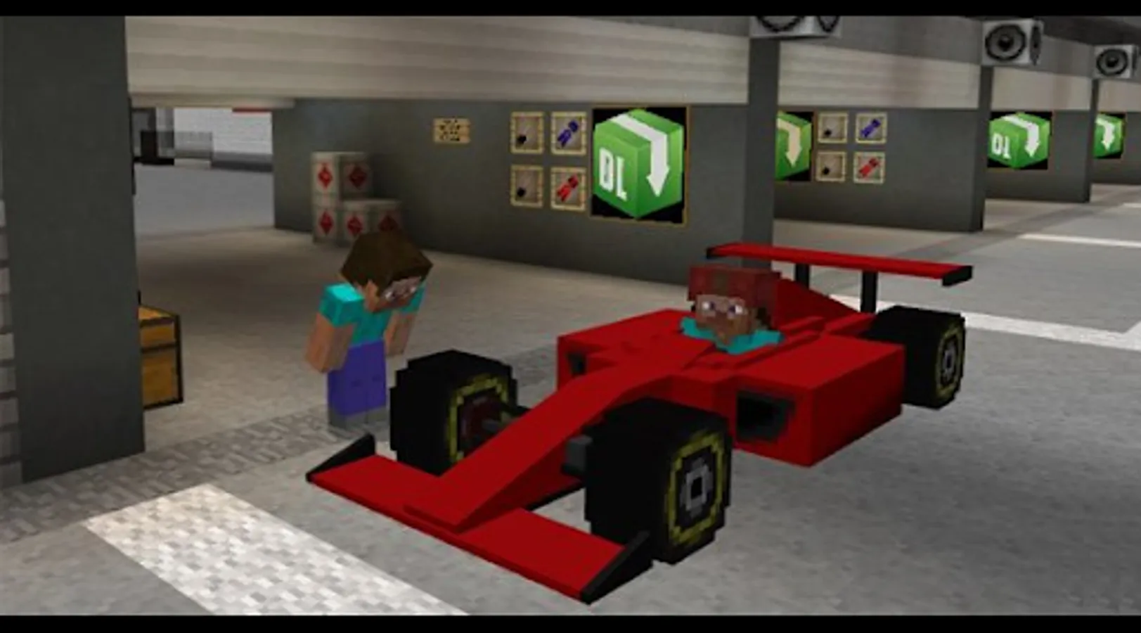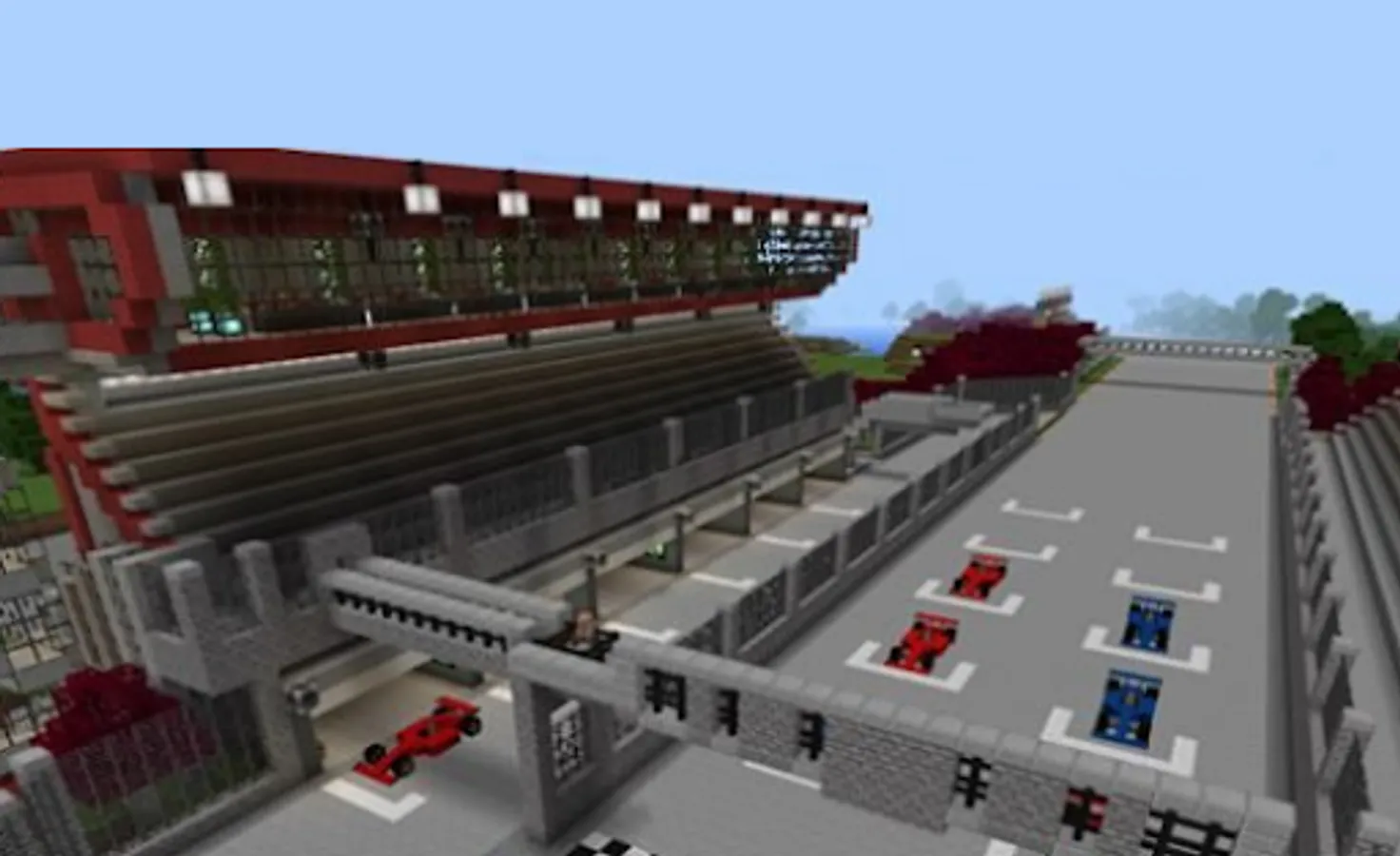 The map is an ordinary race track in the MCPE world. It also has a lot of nice and interesting buildings that might interest you. This map, in my opinion, is suitable for those who want to compete with their friends in races. How to organize your races? To play on this map, you will need to find a competitor, because you will not be riding alone. At the start you will find a few Formula 1 vehicles.