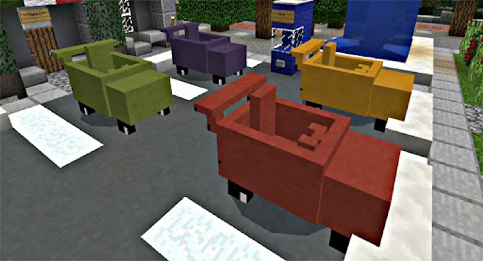 The Mine-Cars Add-on replaces five mobs in-game with five brand new cars. The vehicles are quite fast and offer a great opportunity to more easily move around in Minecraft. The vehicles are very good as they require no fuel. In that sense, it's a car of the future.