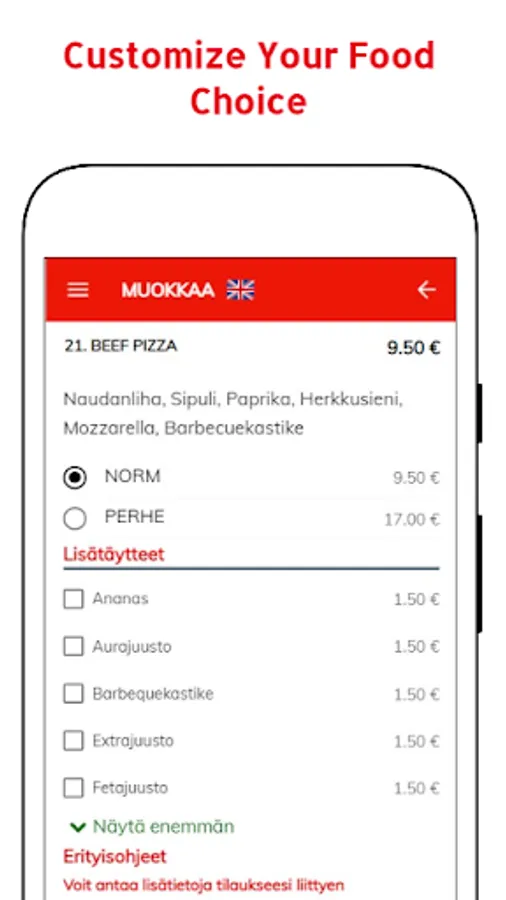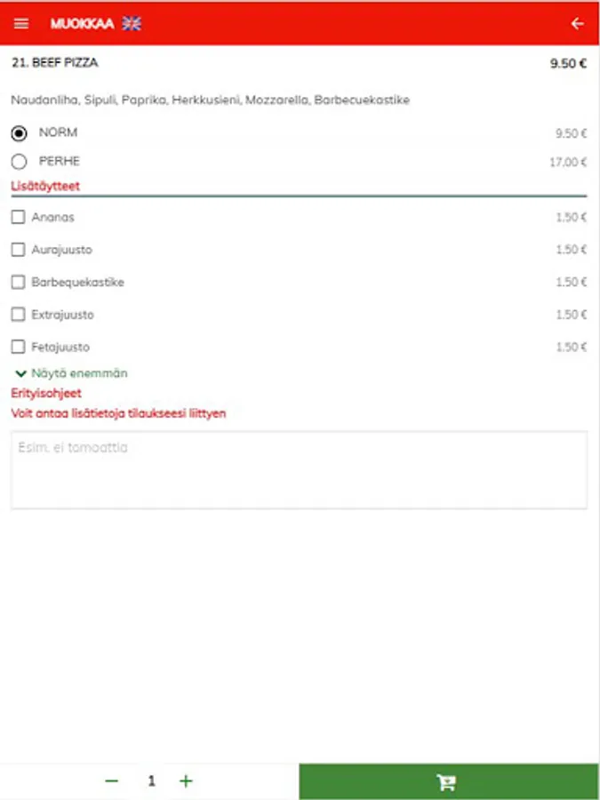 Valittuasi halutun ruoka-annoksen, lisäät sen ostoskoriin – tai valitset esim. lisätäytteitä. Voit tehdä vielä