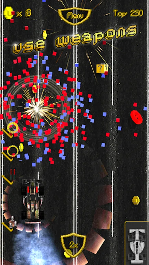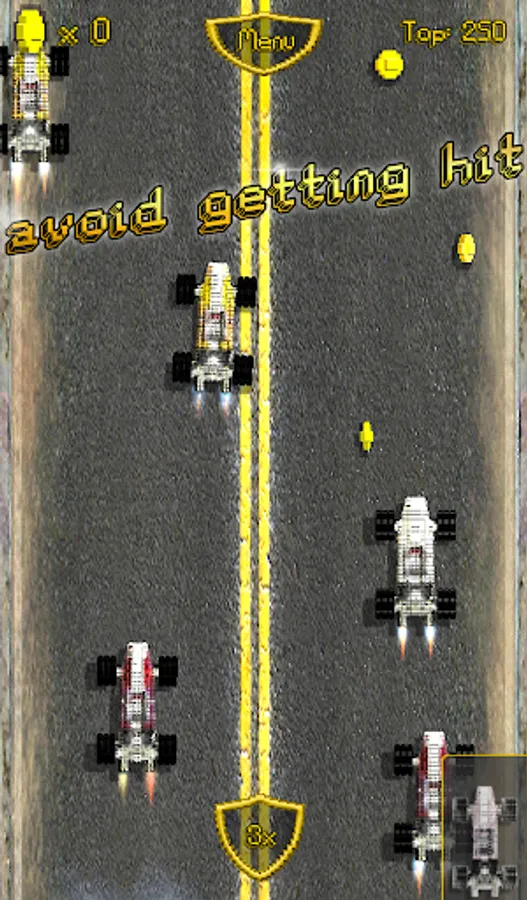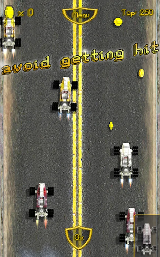Avoid hitting your opponents by steering your race car, or use weapons to destroy them. Survive as long as you can, collect as many coins as you can! Use weapons to destroy your opponents into pixels and protect yourself with shield weapons. Pick up bonuses to get extra points, weapons or to refill your weapon. You can play with street cars, race cars, bikes and tanks with working weapons.