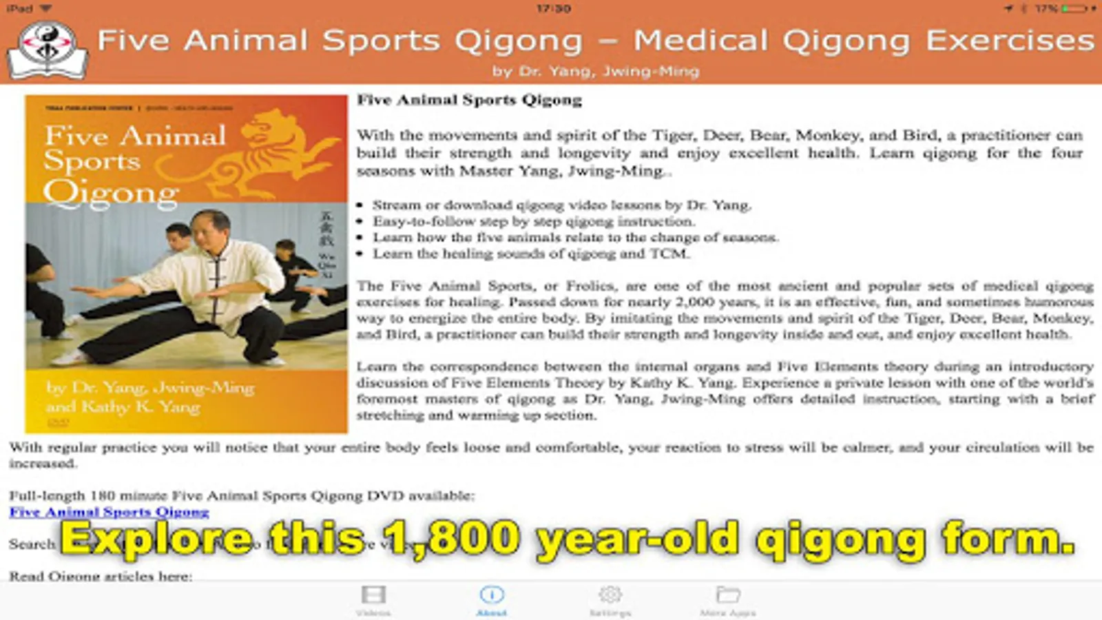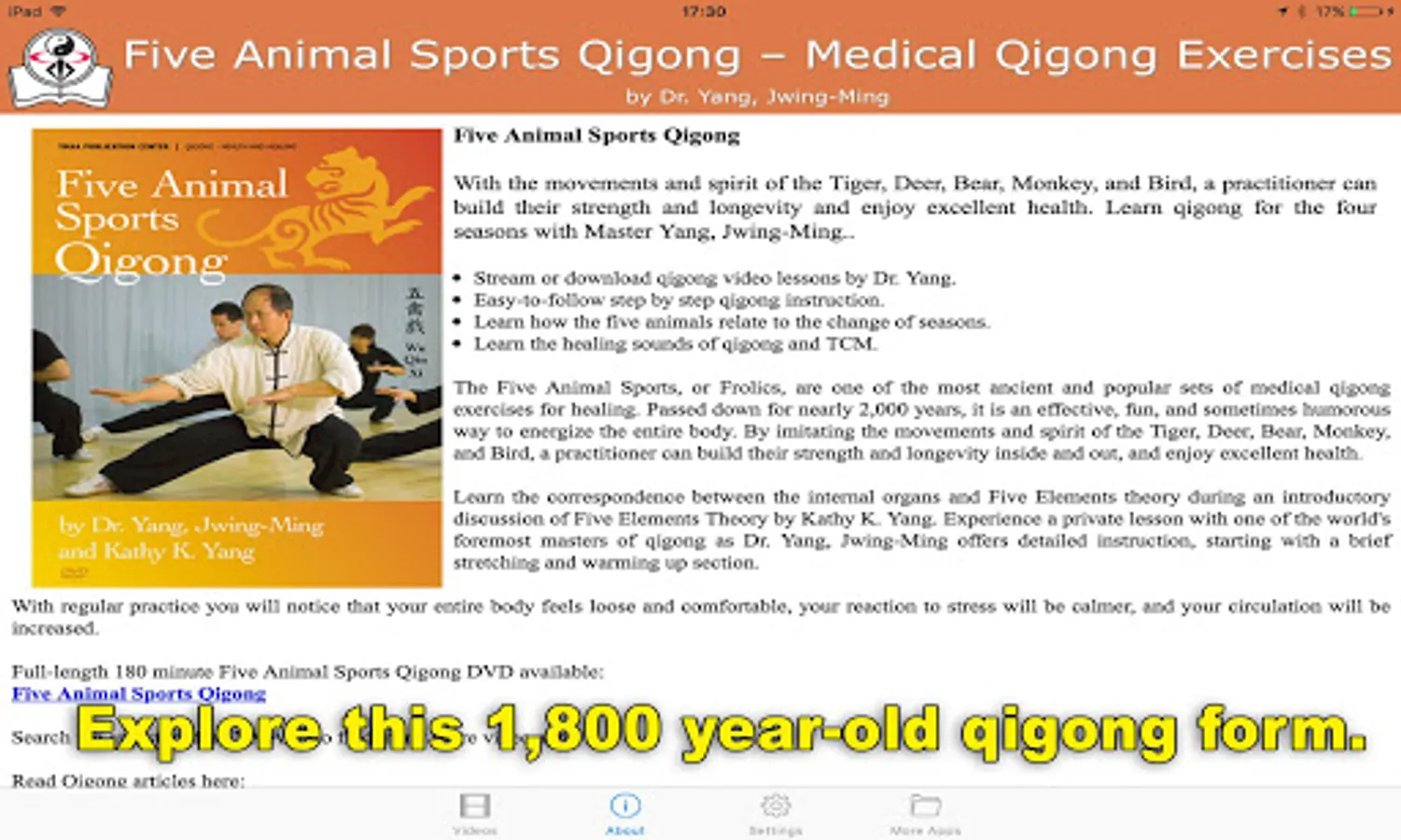 With the movements and spirit of the Tiger, Deer, Bear, Monkey, and Bird, a practitioner can build their strength and longevity and enjoy excellent health. Learn qigong for the four seasons with Master Yang, Jwing-Ming..