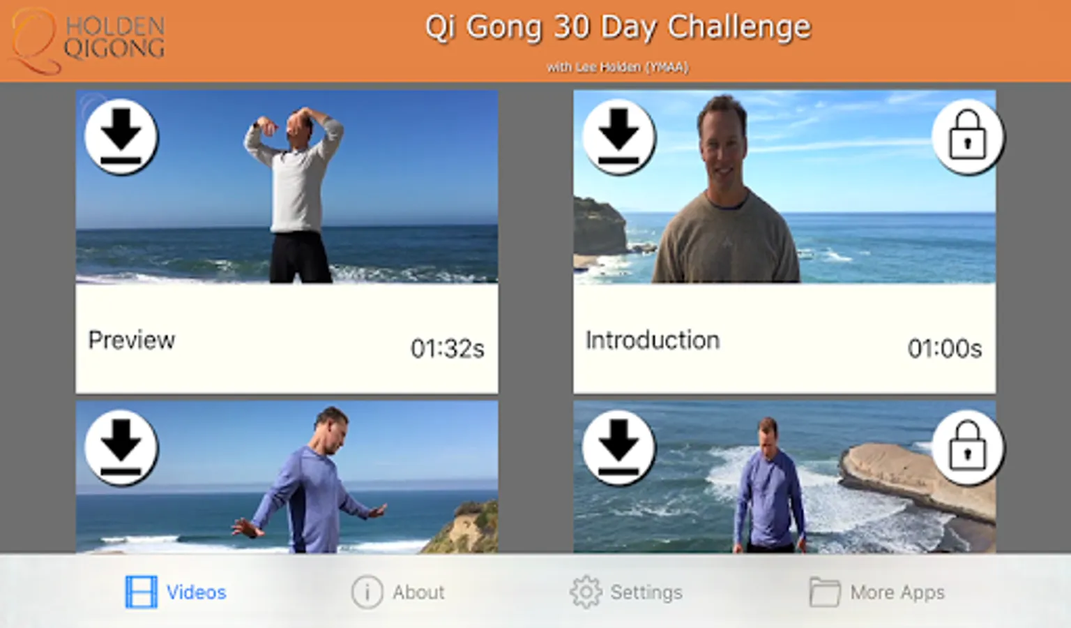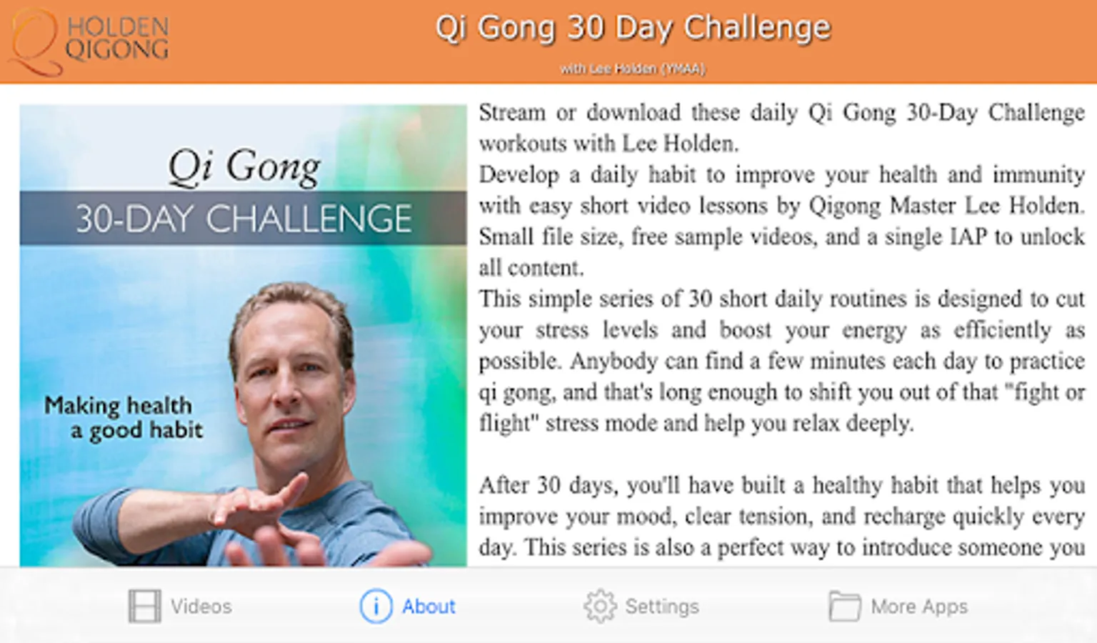 Develop a daily habit to improve your health and immunity with easy short video lessons by Qigong Master Lee Holden. Small file size, free sample videos, and a single IAP to unlock all content.