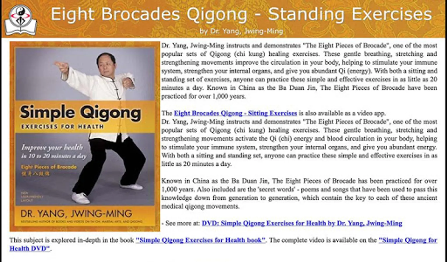 Qigong exercise for Beginners! Master Yang instructs and demonstrates "The Standing Eight Pieces of Brocade", the most popular set of beginner-friendly Qigong healing exercises. This includes 30 minutes of follow-along exercise and then 30 minutes of detailed explanation of how and why the exercises work. These gentle breathing, stretching and strengthening movements improve the Qi (energy) and blood circulation in your body, stimulate your immune system and make you feel great.