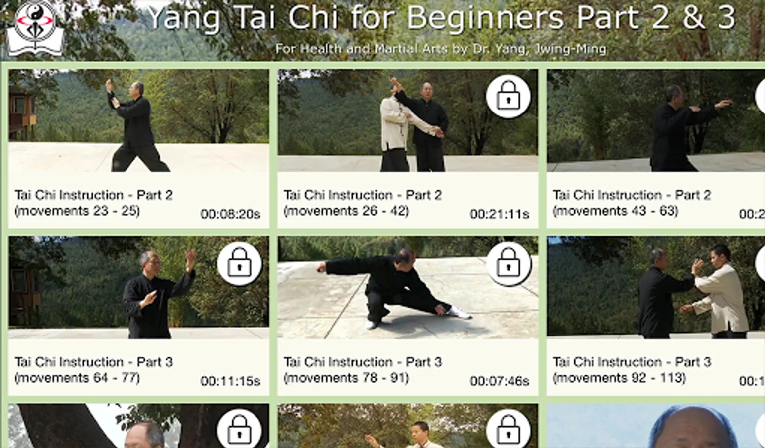 45-minutes of free video! Learn parts 2 & 3 of the complete Yang-style Tai Chi long form with step-by-step instruction by Master Yang (with front and rear view). Offers in-app purchase. Stream or download video lessons.