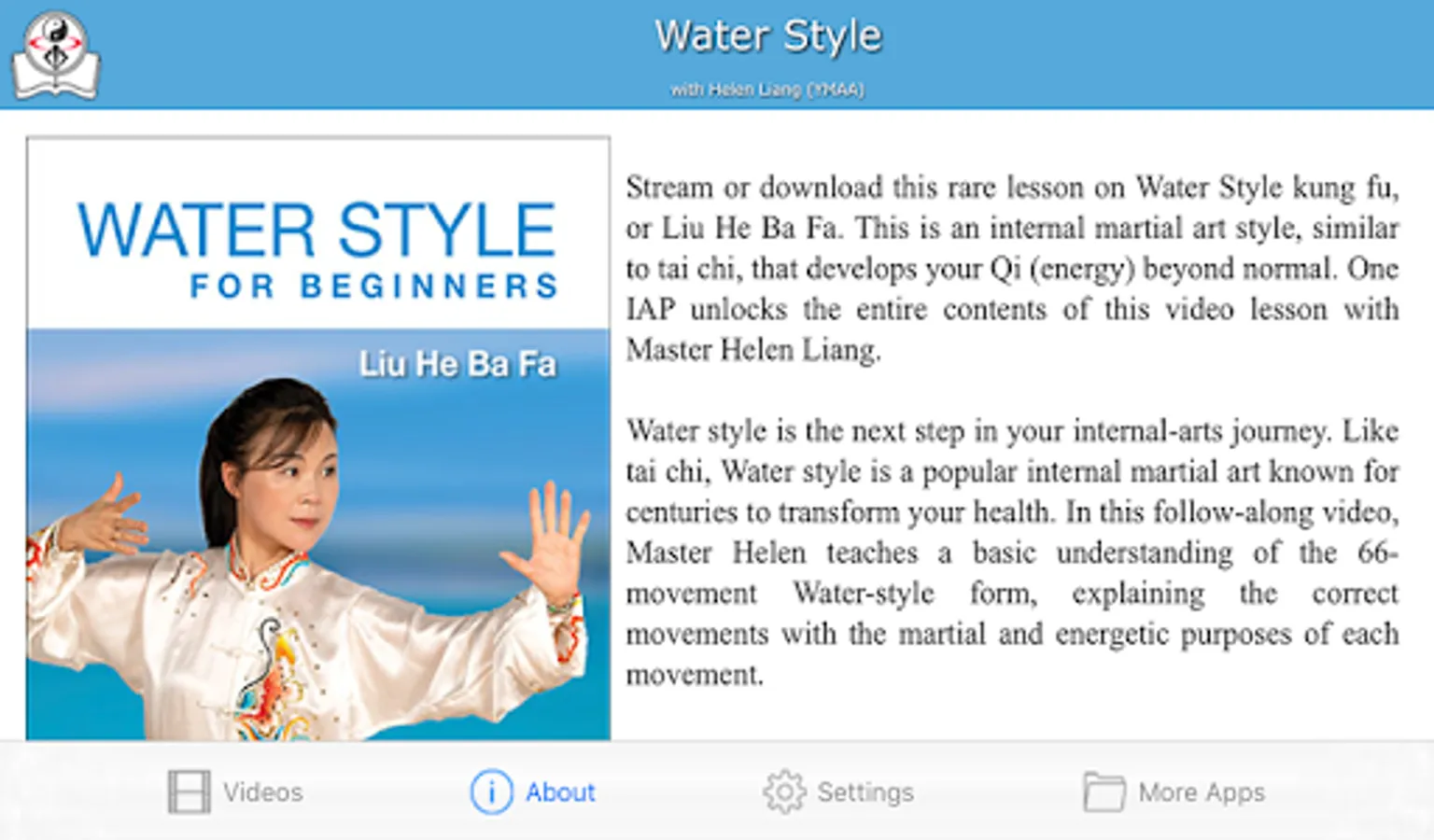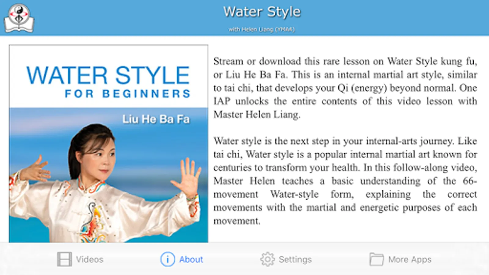 Stream or download this rare lesson on Water Style kung fu, or Liu He Ba Fa. This is an internal martial art style, similar to tai chi, that develops your Qi (energy) beyond normal. One IAP unlocks the entire contents of this video lesson with Master Helen Liang.