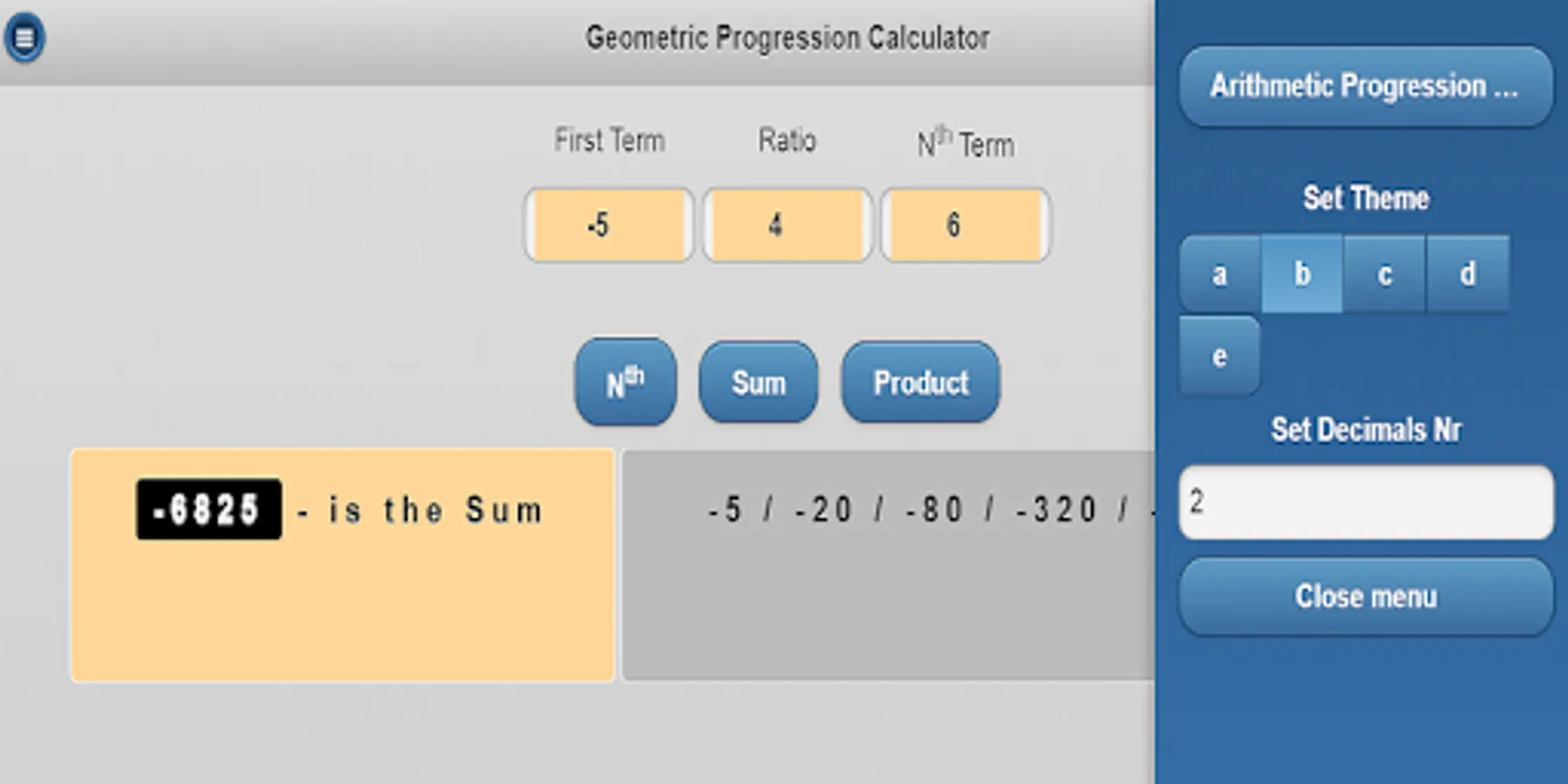 In the Right menu you can access the Arithmetic Progression Calculator ot Change the looks of the app.