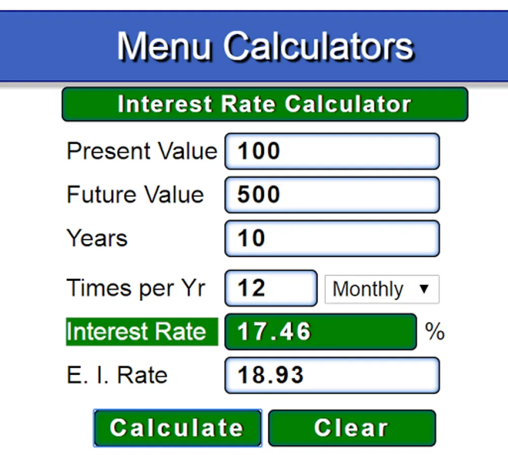 When you have an amount of money, which is your principal or initial investment, that you want to deposit in a bank or invest, and you want to calculate what interest rate (nominal and effective) would give a future amount of money after a number of years (months, days, weeks), this free calculator comes to your aid.