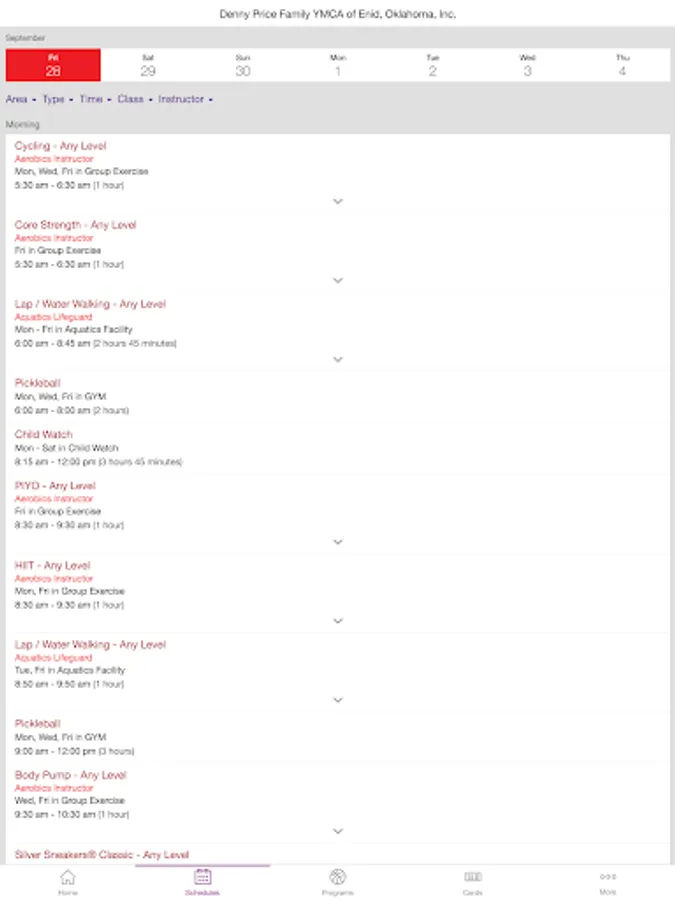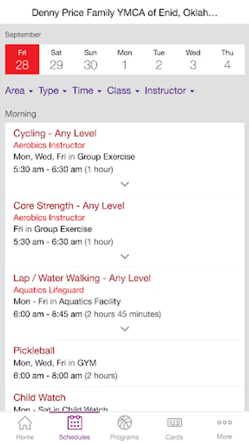• Easily view schedules for each day and filter for the types of classes that you like.