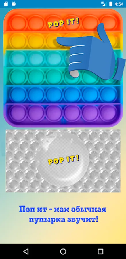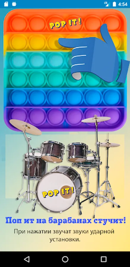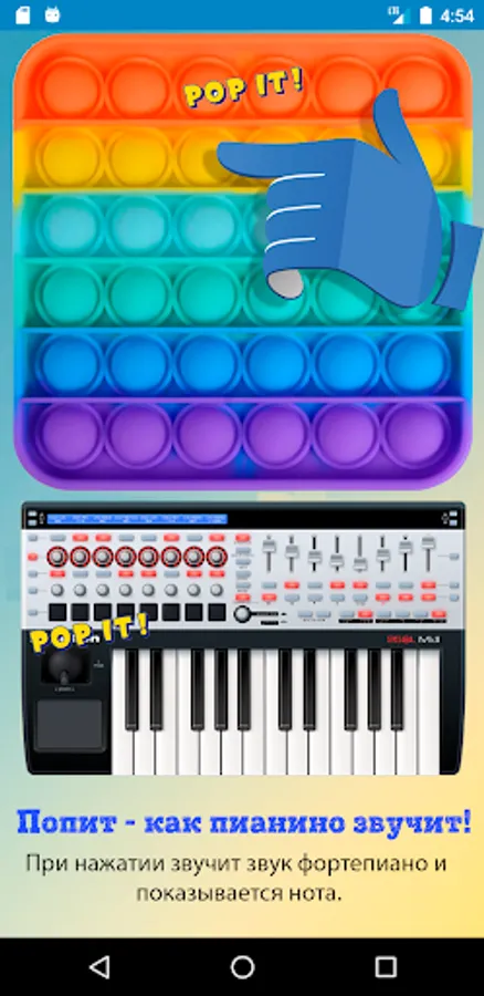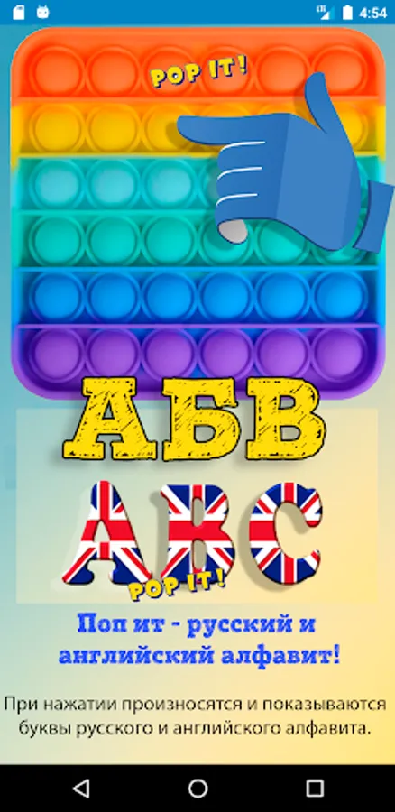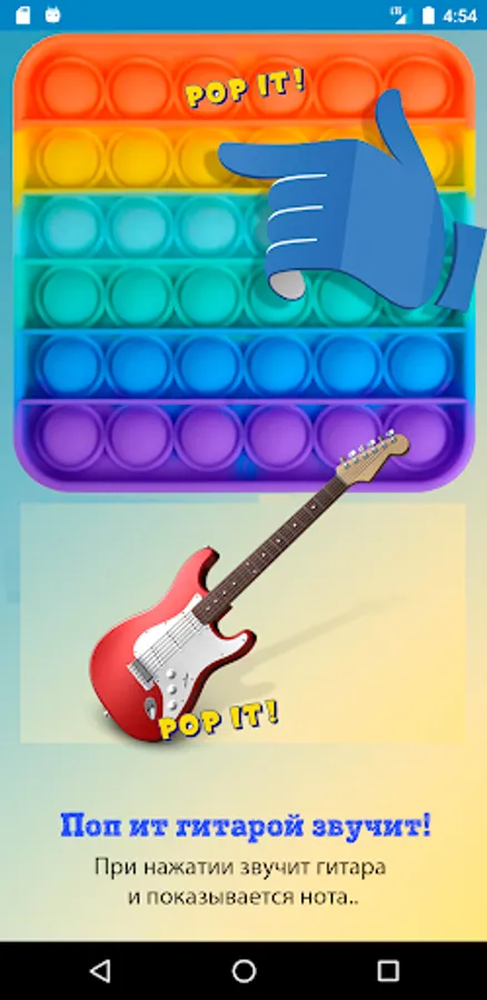Play! Study! Have some fun! This unusual educational "Pop it" includes playing various musical instruments, learning the alphabet and other functions. Piano, guitar and drums in the musical part, with the display of notes. Russian and English alphabets, and the classic "bubble wrap".