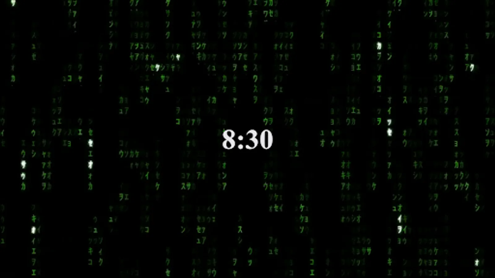 The screensaver begins with a dark screen on which characters resembling green numbers and punctuation marks appear and slowly arrange themselves. These symbols flicker and move across the screen, giving the impression that the viewer is entering a virtual world.