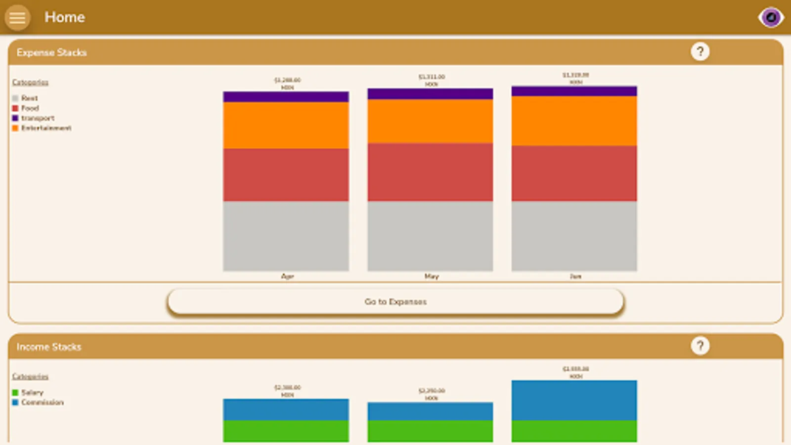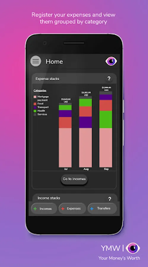 As you register information, the widgets in the home screen will let you see the outcome of your financial behavior of the current and last two months, grouped by categories.