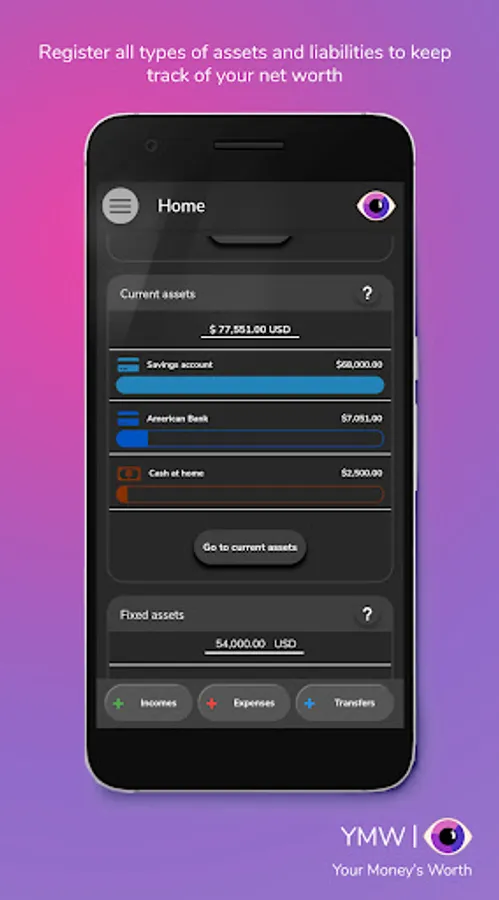 You can see them in comparison one to another in the home widgets. In our app you can manually register any bank account, any asset, and any liability using several currencies. When you add them up altogether you get what is called your net worth.