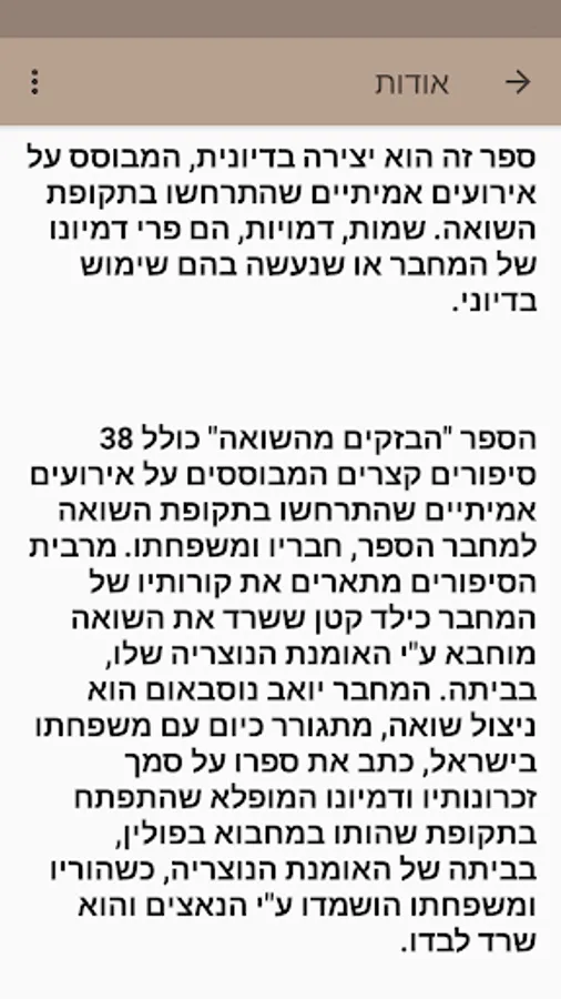 The book Flashes from the Holocaust describes the Holocaust period in a different and special way through a mixture of imagination and reality, real and fictional events, a world parallel to reality and a new approach to the story of the Holocaust and its survivors, the story of the Holocaust and heroism on another side that was never published. This is the first book of prose by the author Yoav Nussbaum, published for the first time in an Android version in Hebrew.