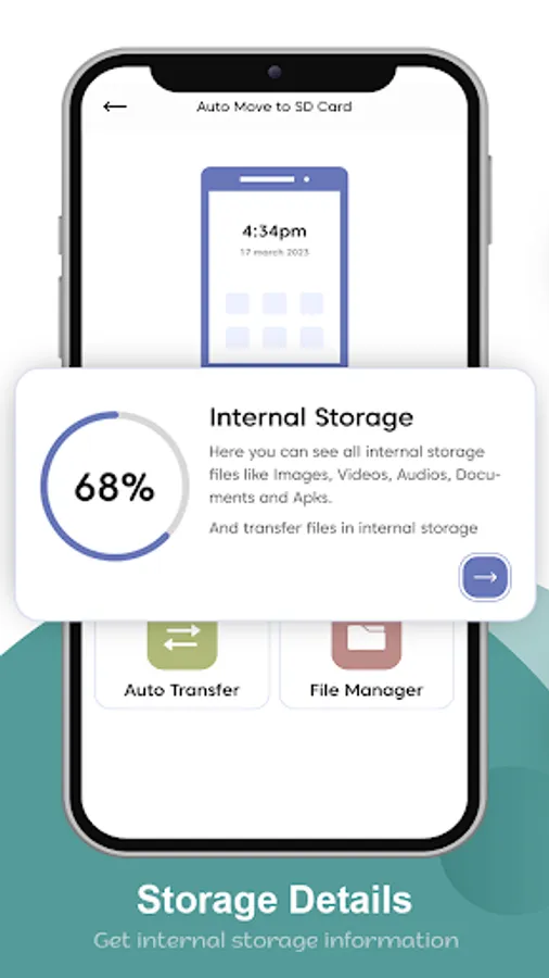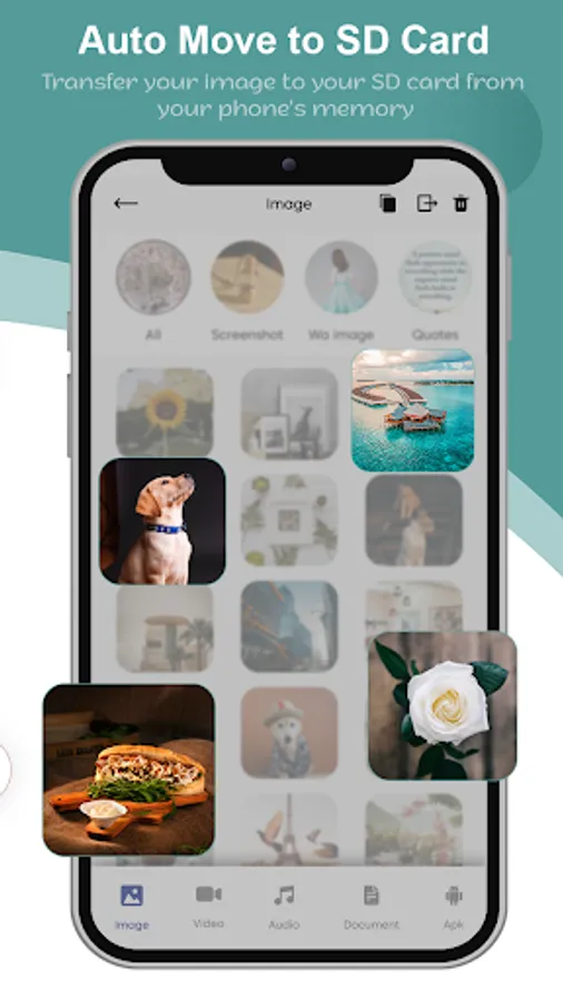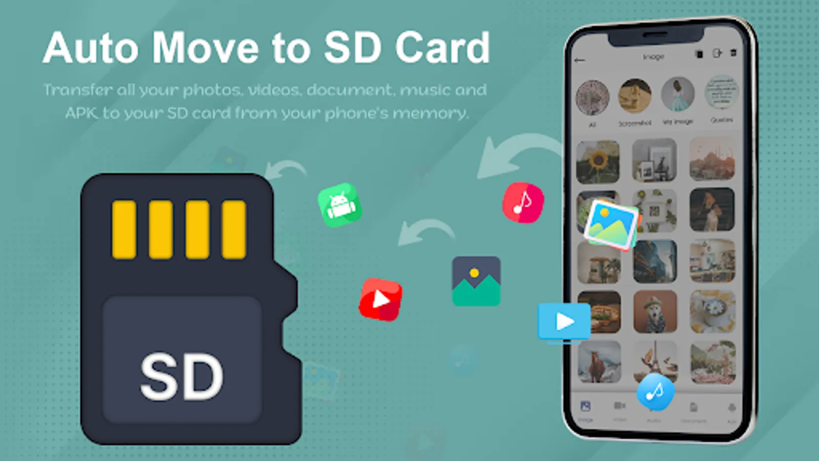 Auto Move to SD Cardapp help to transfer all your files from the internal memory to the SD card in your phone. Copy and move your apps, Images, Video, Audio, and Documents to your SD card. This app is mainly useful for devices with small internal memory which does not allow saving your files directly to an SD card.