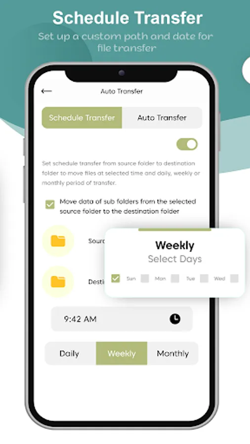 In this scheduled transfer, you can select the source folder and destination folder and also set the time of file transfer. So the file transfer at the selected time and periods of daily, weekly, or monthly.