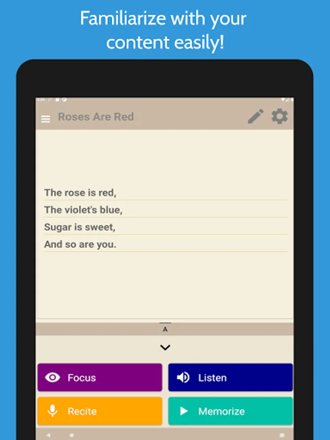- You can memorize / learn poems , songs, proverbs, speeches, anthems, Holy Book verses, shortly anything you want! Are you a lawyer? Memorize laws easy! Recite, fill the blanks, write the content! Whatever you're looking for is in this app!