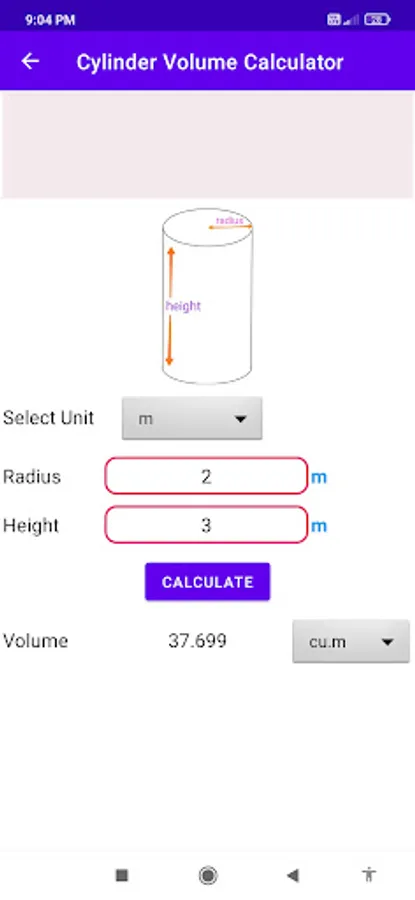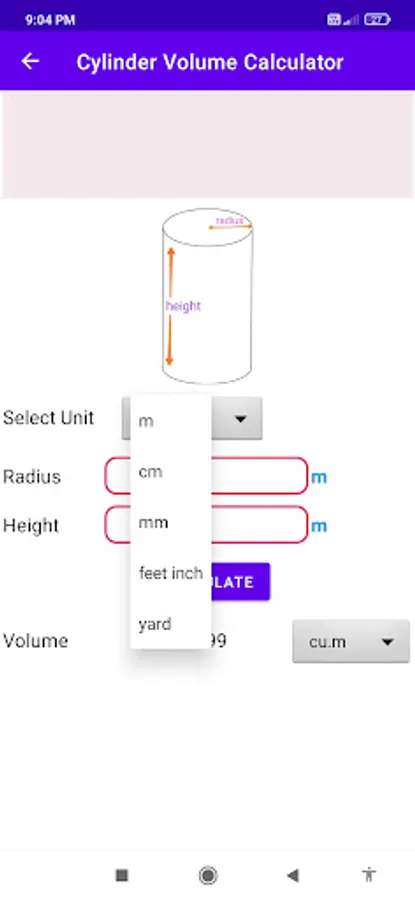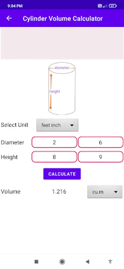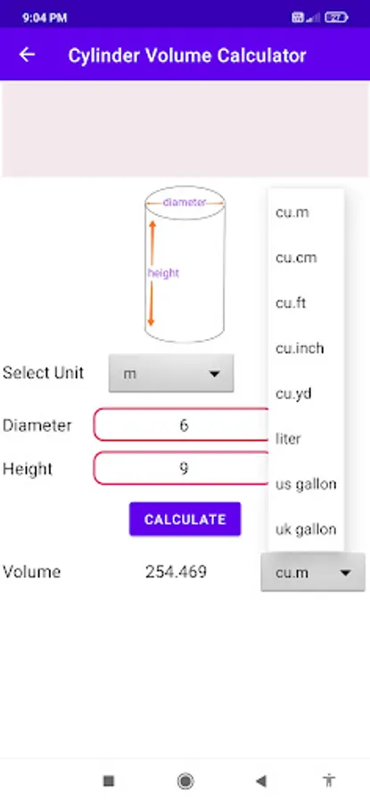 This app is used to calculate cylinder volume for given radius, diameter, height. You can enter dimensions in different units like meter, feet, inch, mm, cm, yard etc and result you will get in cubic meter, cubic foot, cubic yard, gallon, liter etc.