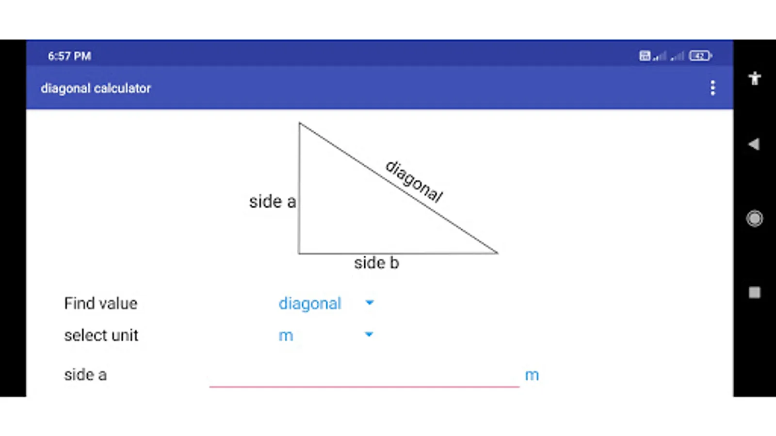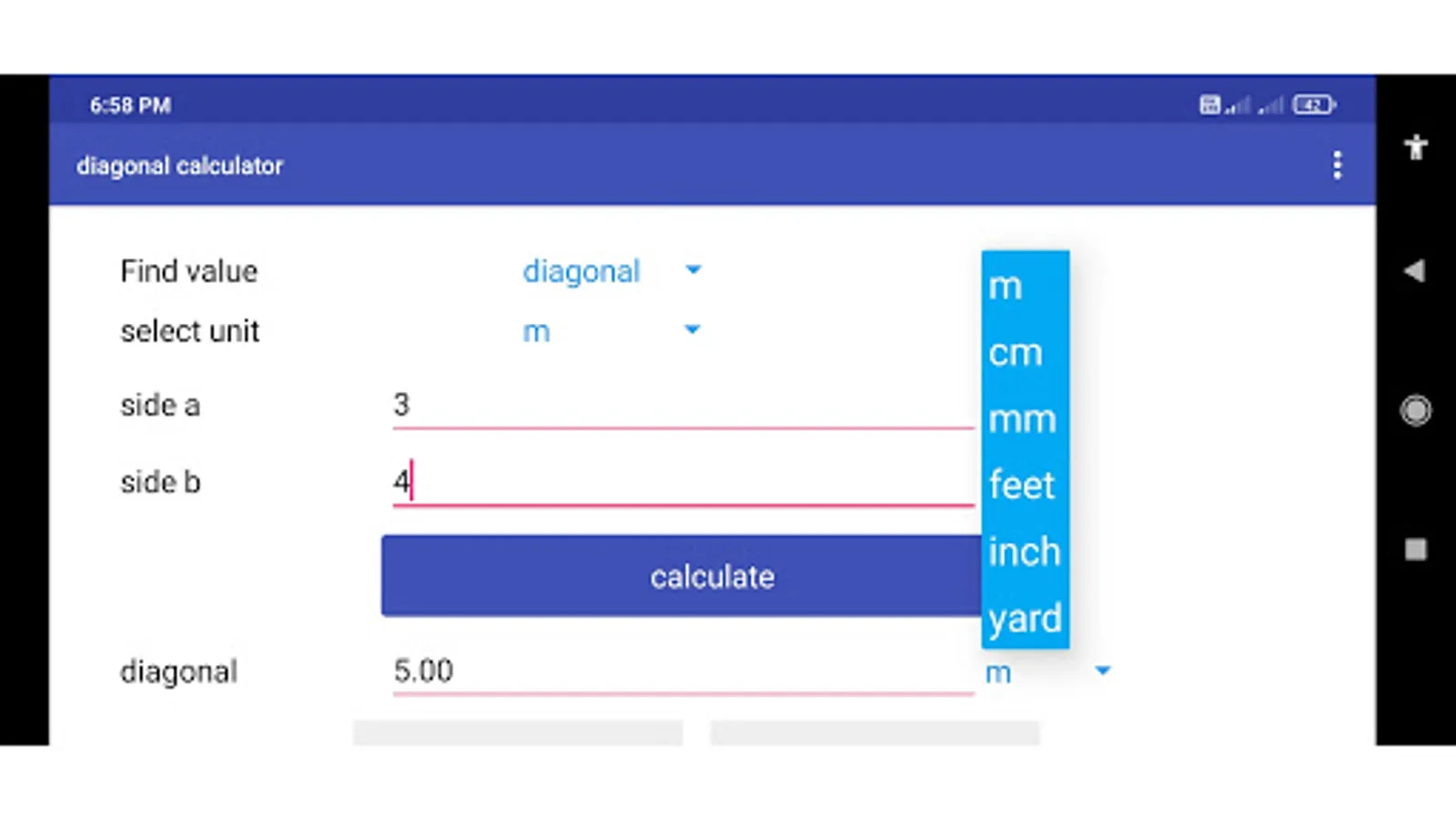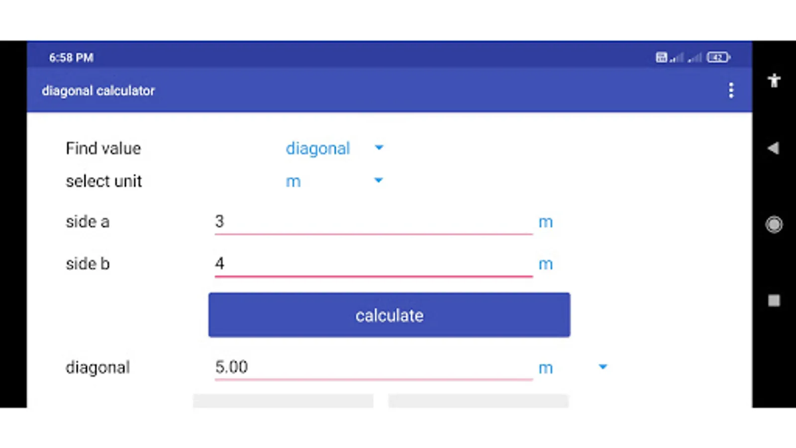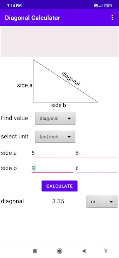 The diagonal calculation is mostly used in construction works to cross-check the works. This app calculate diagonal by using pythagoras theorem. In this app you can enter dimensions in different units like meter, feet-inch, yard, mm etc.