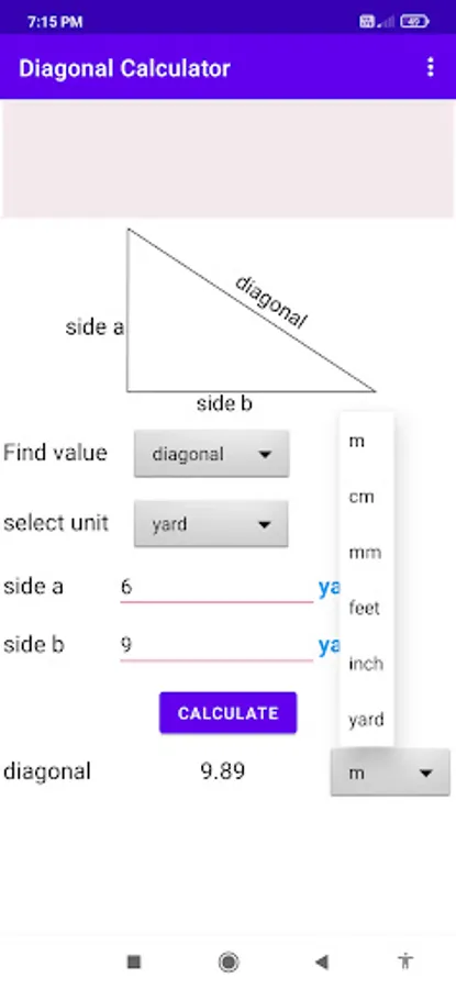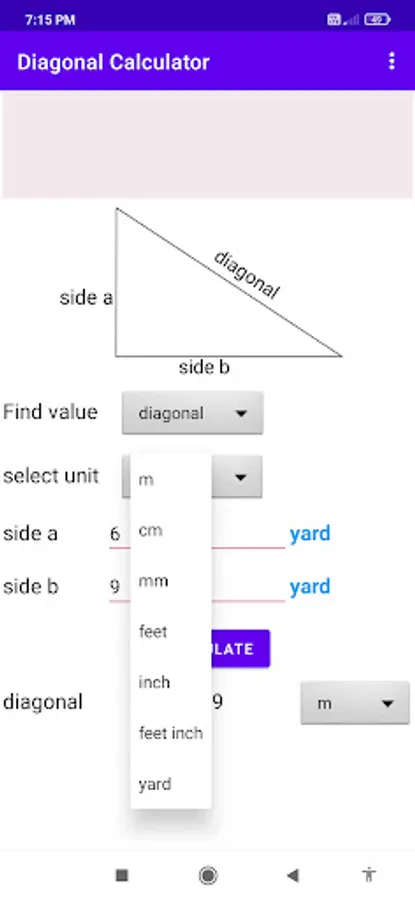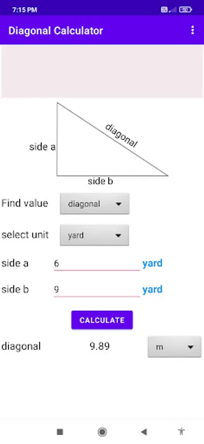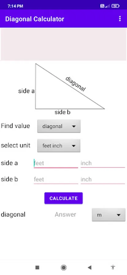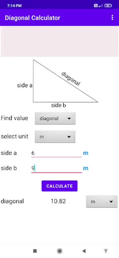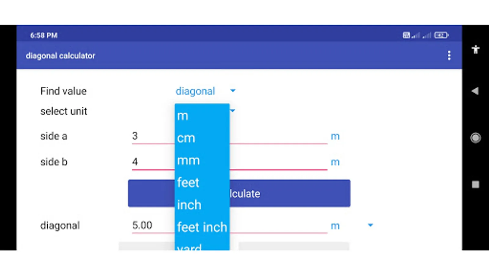 The diagonal calculation is mostly used in construction works to cross-check the works. This app calculate diagonal by using pythagoras theorem. In this app you can enter dimensions in different units like meter, feet-inch, yard, mm etc.