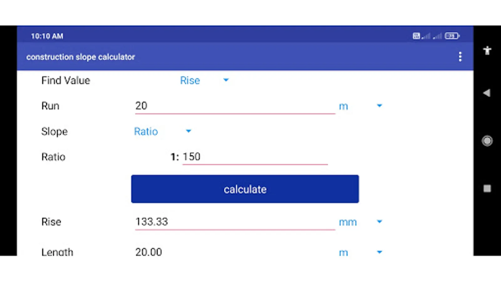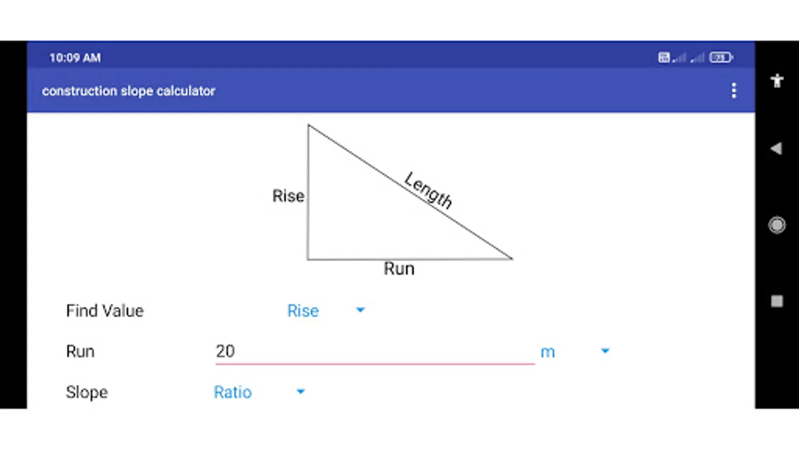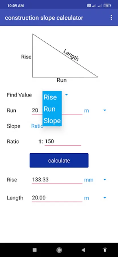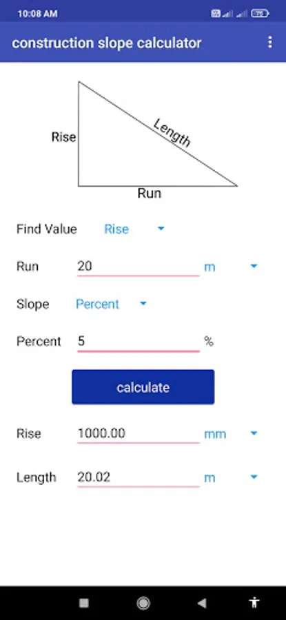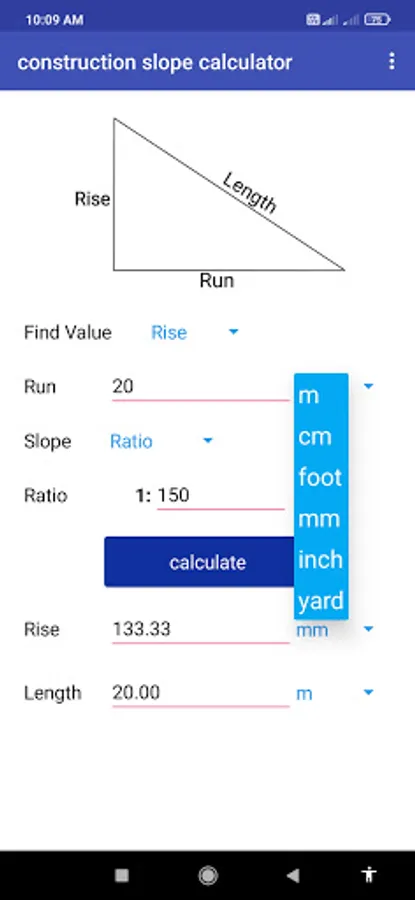 This app calculates slope for given ratio and run. In many works the slope calculation is used, But mostly it is used in construction works. The app also provide feature of enter the dimensions in different units eg. meter, centimeter, yard, feet, inch, feet-inch.