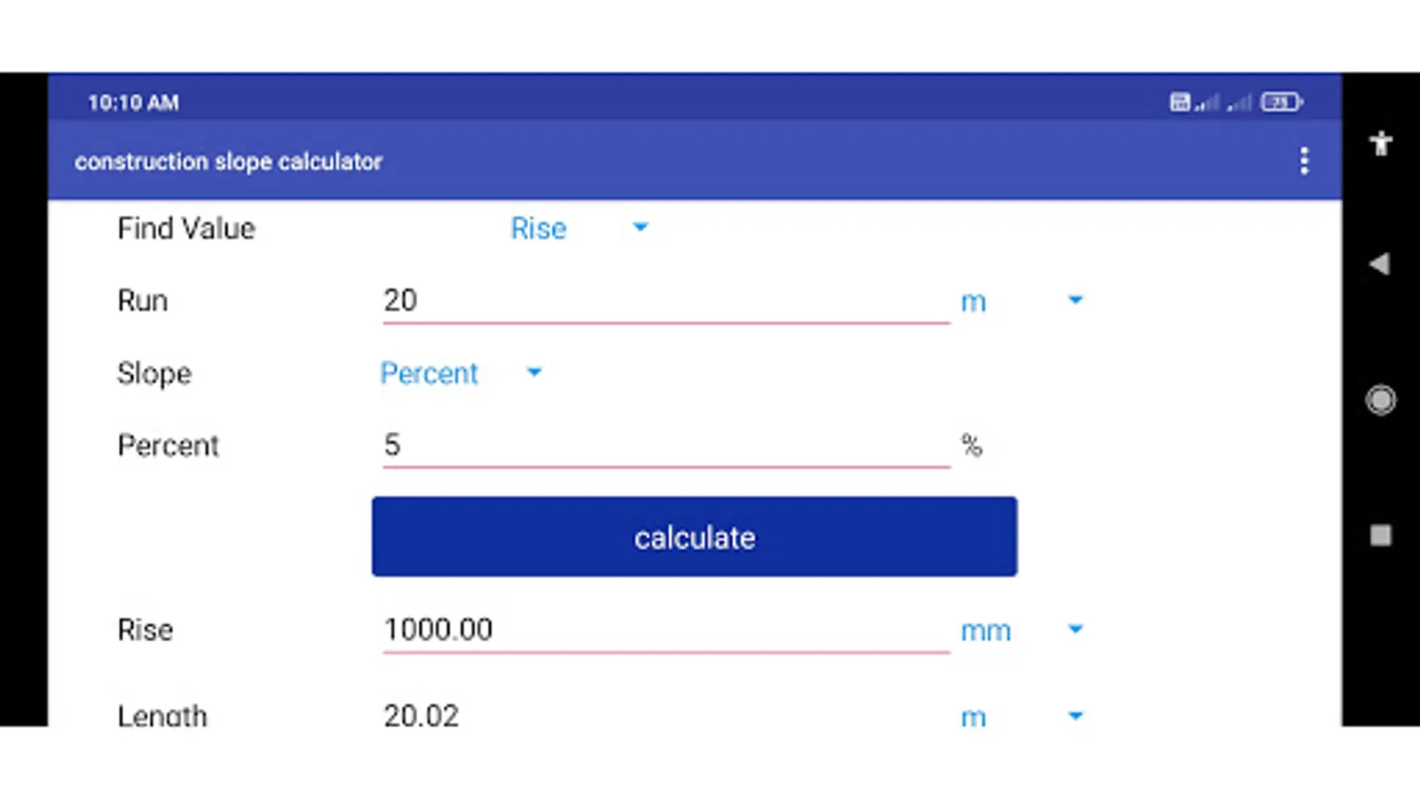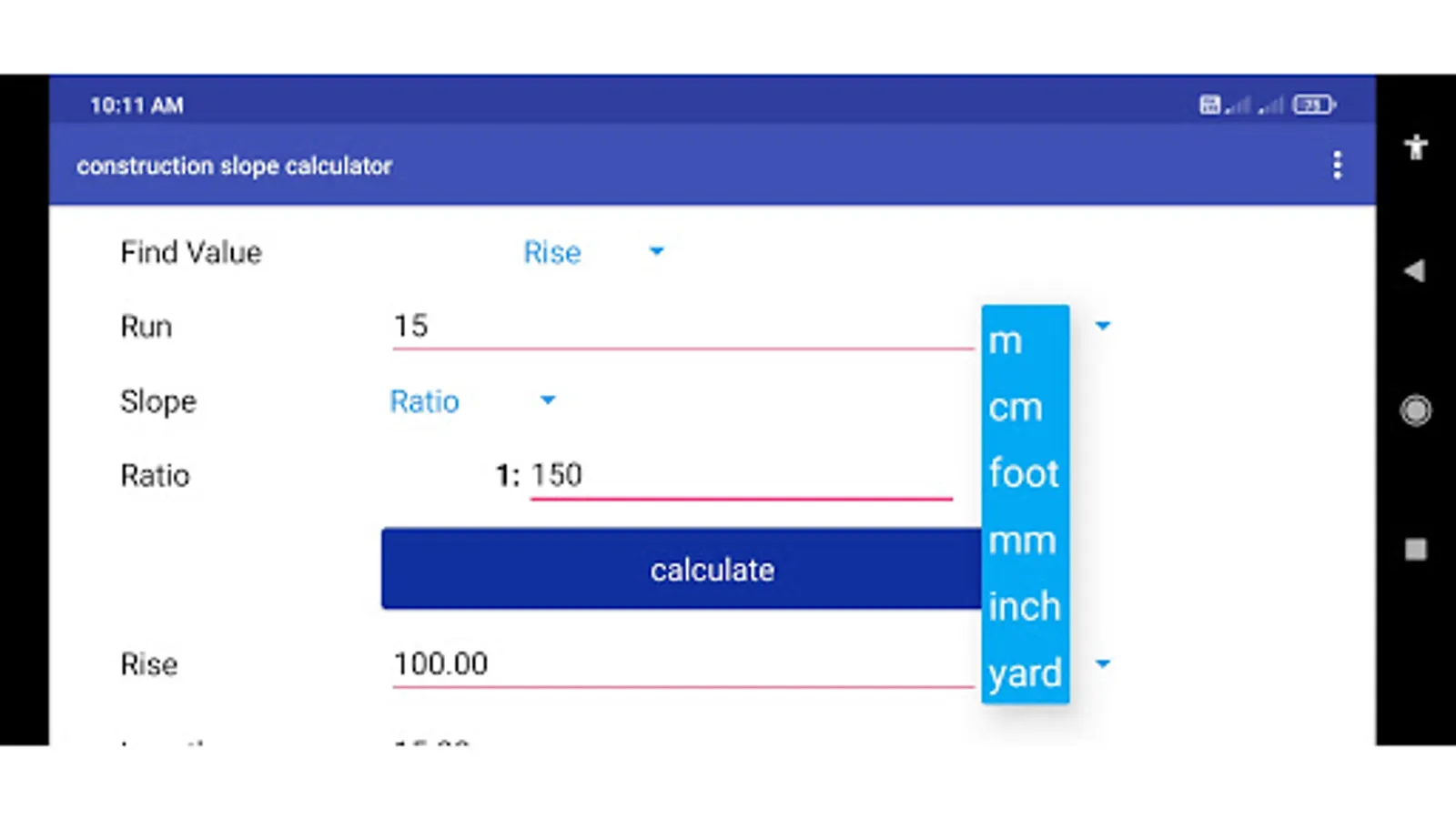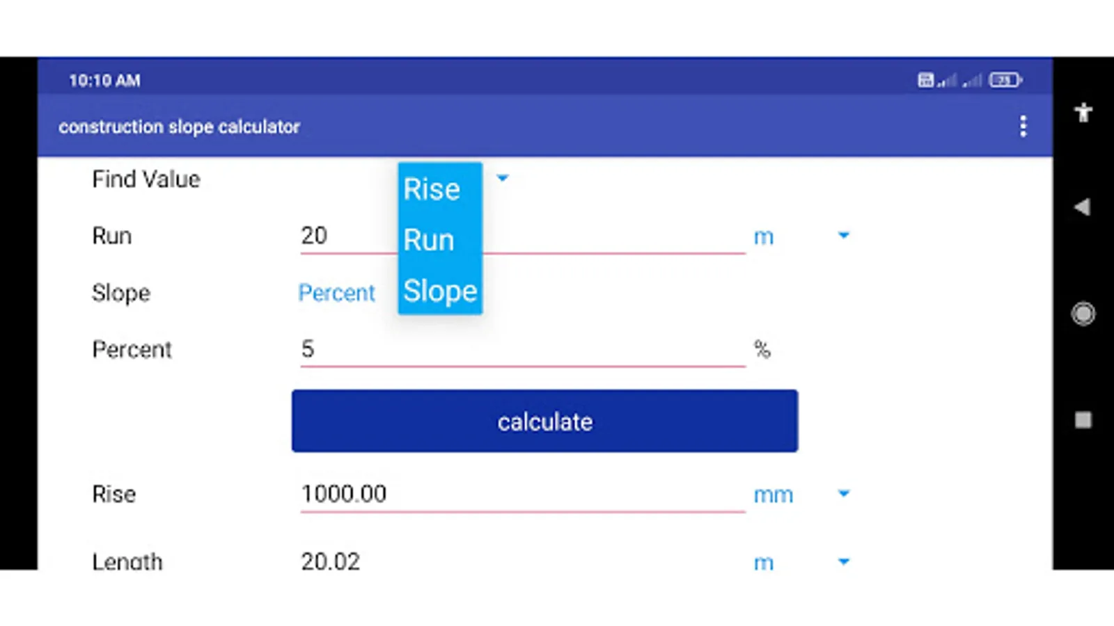 This app calculates slope for given ratio and run. In many works the slope calculation is used, But mostly it is used in construction works. The app also provide feature of enter the dimensions in different units eg. meter, centimeter, yard, feet, inch, feet-inch.