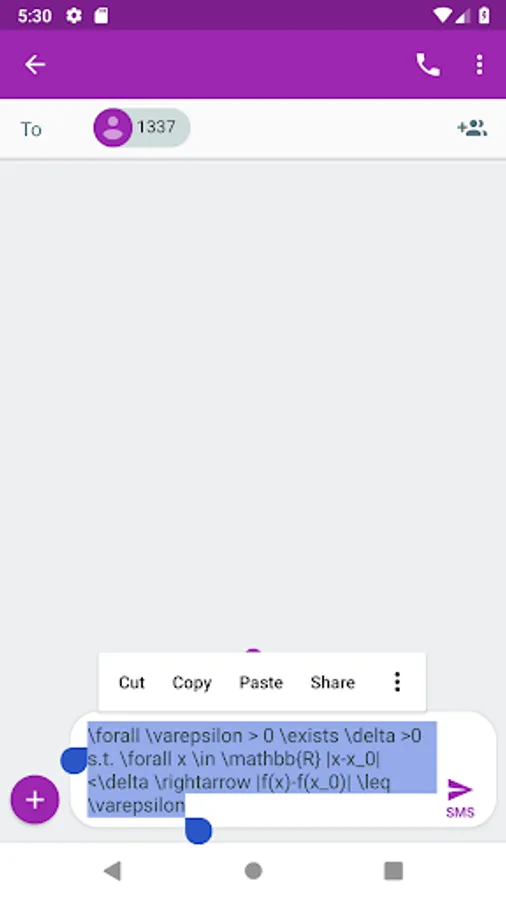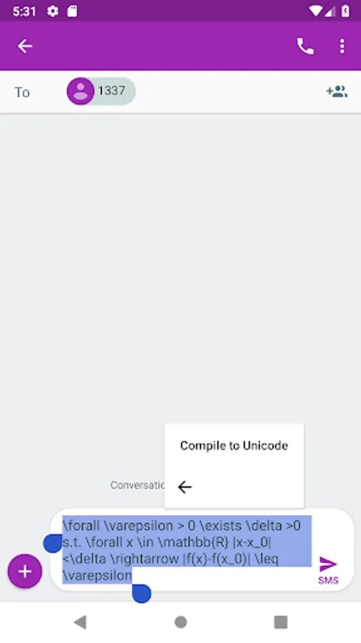 The app allows you to compile subset of LaTeX to Unicode characters, allowing you to send a readable text to anyone. Works in any app that support text actions, relying on android system UI. No Ads or analytics!