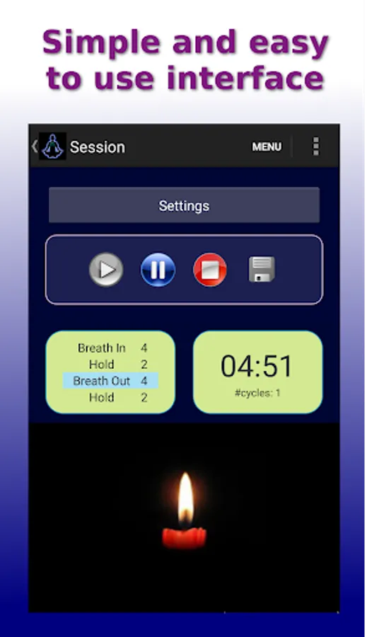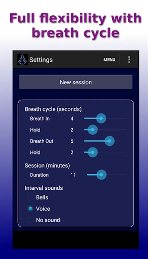 Welcome to the meditation breath cycle application. This app is designed to help support a person learning the art of meditation through structured breathing. Through increasing awareness of our breathing through simple but powerful timing exercises we are able to more quickly realize some of the many benefits of meditation.