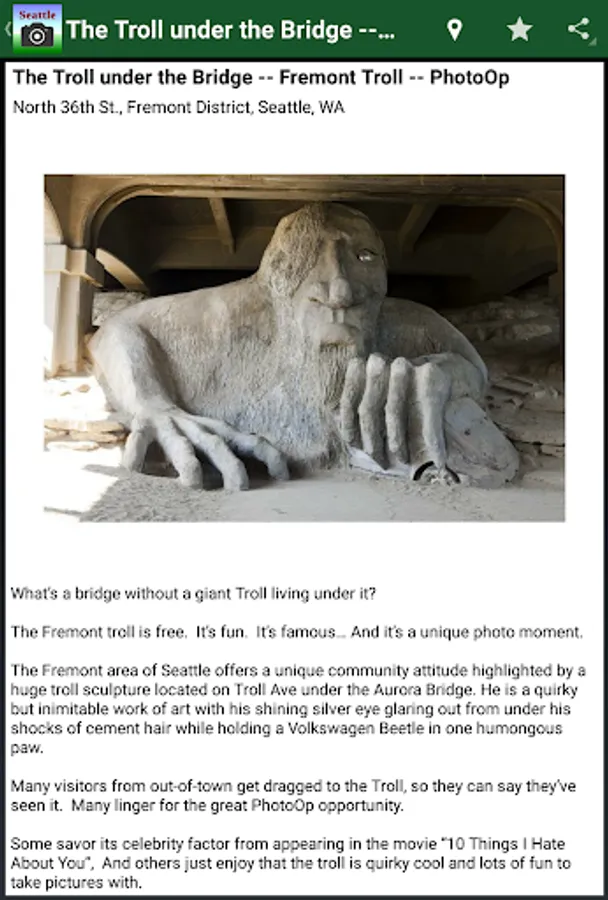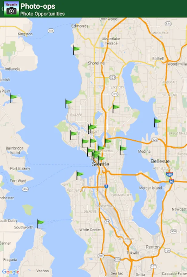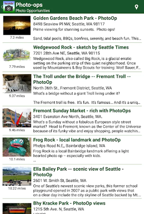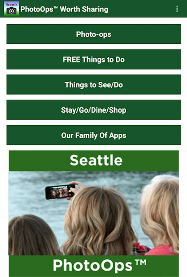 Wherever you are in Seattle, this budget-friendly app identifies and locates postcard-worthy photo sites as you are on-the-go with your smartphone in-hand seeking and capturing photo sights worth sharing. Seattle PhotoOps app gives you example photos, locations, mapping, and even directions from current location to a PhotoOps location. Seattle PhotoOps includes: