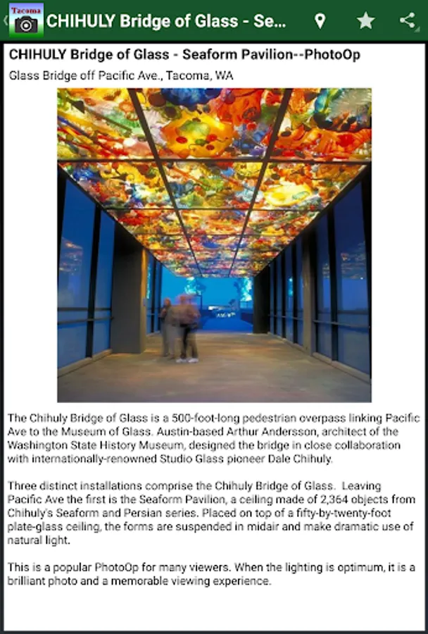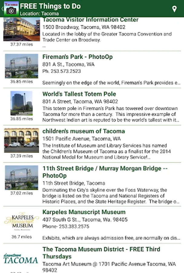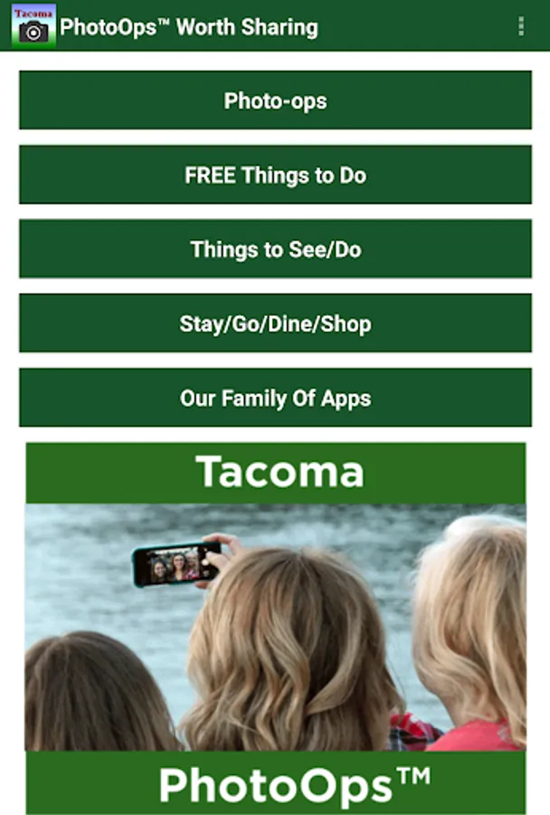 Wherever you are in Tacoma, this budget-friendly app identifies and locates postcard-worthy photo sites as you are on-the-go with your smartphone in-hand seeking and capturing photo sights worth sharing. Tacoma PhotoOps app gives you example photos, locations, mapping, and even directions from current location to a PhotoOps location. Tacoma PhotoOps includes: