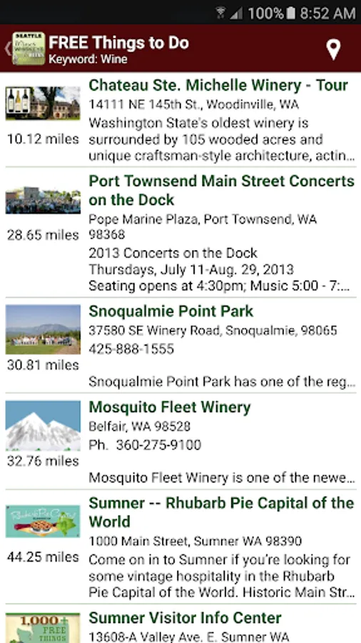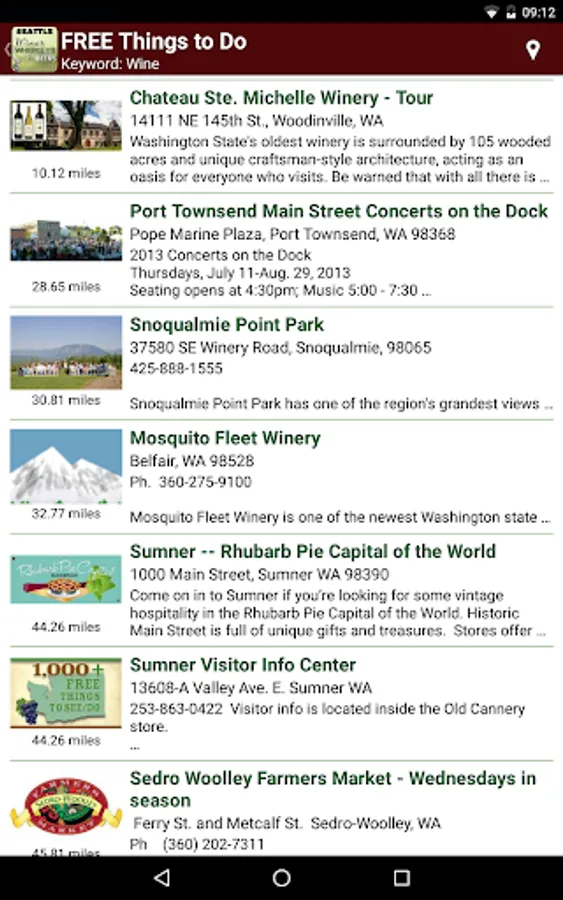 This app highlights visitor information recommended by local experts. This app is most definitely the best mobile resource available for locating tasting rooms as well as free things to see/do around Seattle. This app works 24/7 for visitors carrying smart phones and using GPS to locate “nearby” tasting opportunities along with photo ops and things-to-see/do.